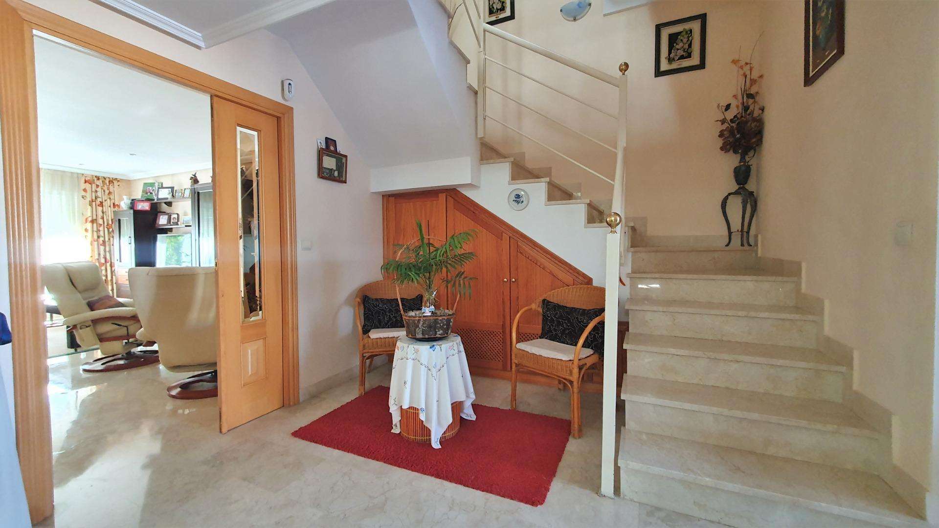 Esta casa pareada en la zona de Selwo, Estepona, es una propiedad única que ofrece una amplia variedad de características excepcionales para disfrutar. Se encuentra en una zona muy soleada y cuenta con unas vistas al mar impresionantes desde varias terrazas, lo que la convierte en un lugar idílico para relajarse y disfrutar del paisaje.~~La propiedad tiene una distribución de tres plantas que se adapta perfectamente a las necesidades de una familia. En la planta baja, encontramos una cocina moderna completamente equipada con comedor, un aseo y un acogedor salón que se abre a dos terrazas y un jardín privado de 180m2. Es un espacio perfecto para disfrutar de cenas al aire libre, tomar el sol o simplemente relajarse en la tranquilidad de un espacio privado.~~En la segunda planta, hay tres dormitorios, el principal con un vestidor y baño en-suite, y un segundo baño completo para las otras habitaciones. Además, hay dos terrazas, una orientada al este y otra al oeste, que proporcionan mucha luz y ventilación natural, y permiten disfrutar de unas vistas panorámicas espectaculares.~~En la tercera planta, hay dos solariums, que ofrecen un espacio adicional para disfrutar de las vistas al mar y alrededores de Estepona.~~Además, la propiedad cuenta con un garaje privado y trastero en la semisótano, proporcionando un espacio seguro para el almacenamiento y estacionamiento de vehículos.~~En resumen, esta casa pareada en la zona de Selwo, Estepona, es una oportunidad única para disfrutar de una propiedad con todas las comodidades y características necesarias para vivir cómodamente. Con su amplia variedad de terrazas, jardines y vistas panorámicas, esta propiedad es ideal para aquellos que buscan un hogar donde disfrutar de la tranquilidad y el lujo.~
