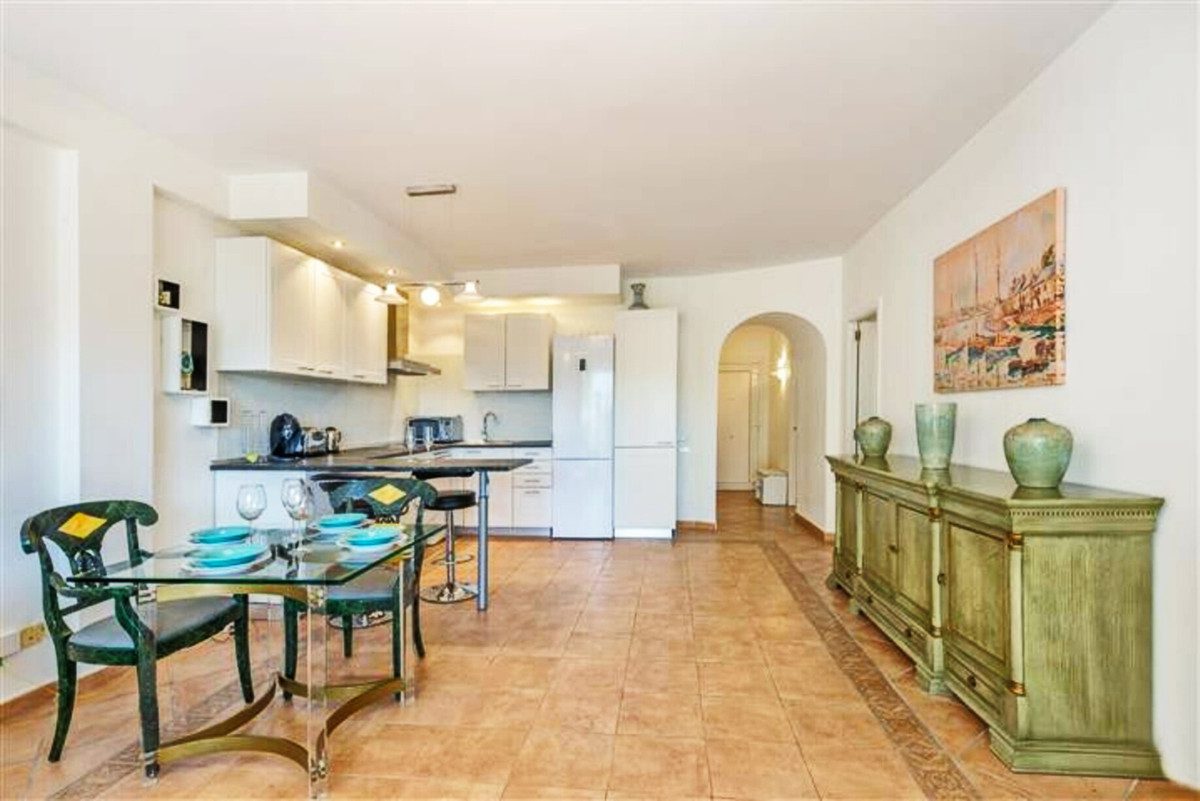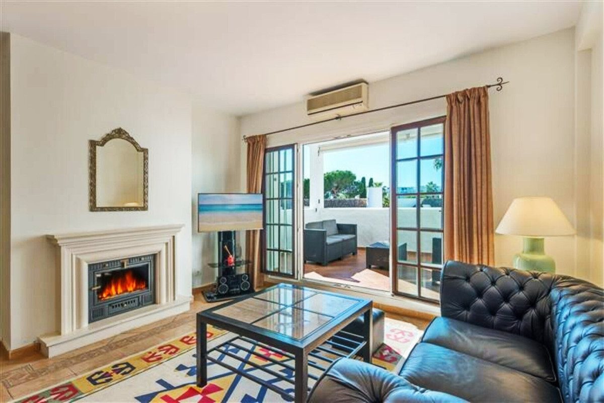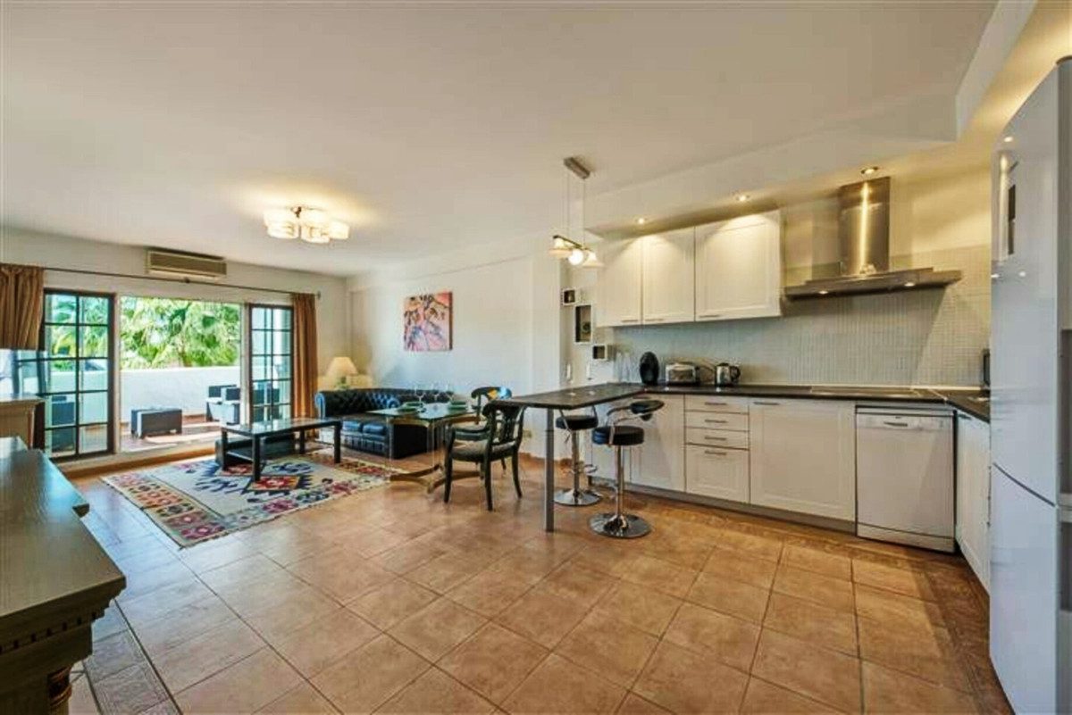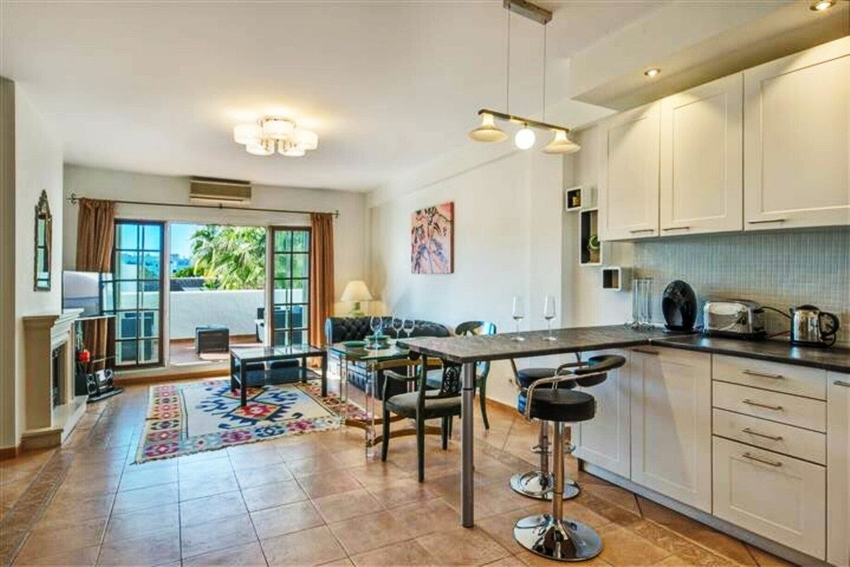 Amplio apartamento en Villa Marina, Puerto Banus. La propiedad ofrece cocina americana, salón/comedor con chimenea, con acceso directo a la terraza orientada al sur y con vistas a la piscina, dormitorio principal con su baño en suite, dos dormitorio de invitados con baño. Parking comunitario. Complejo cerrado situad al lado playa y todos tipo de servicios.~
