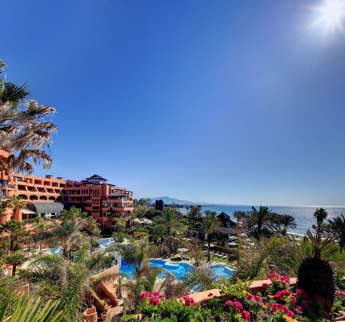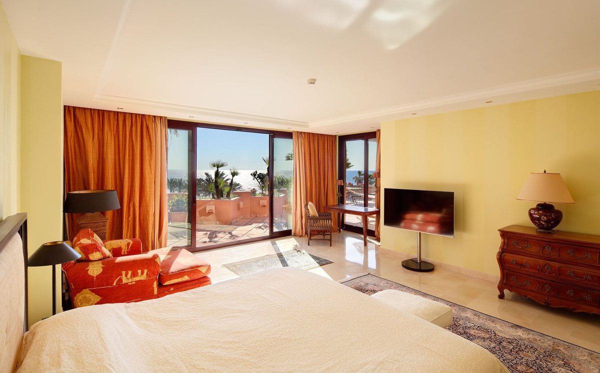 Atico Hotel Kempinski, ala privada.Amplio y lujoso ático de alta calidad situado en el 5 * Hotel Kempinski. Orientación sur con vistas panorámicas al mar, primera línea de playa. Servicio completo de hotel con el uso de todas las instalaciones.Todo en una planta, 358m2 construidos más 283m2 terrazas.Un ascensor privado conduce a un pasillo impresionante. Amplio salón-comedor con techos altos y chimenea. Cocina amueblada, parcialmente abierta. Acceso directo desde todas las habitaciones a las terrazas con zona de barbacoa y jacuzzi. Dormitorio principal con vestidor y dos dormitorios. Aseo de invitados, área de lavandería. Dos garajes y trasteros.Uso de todas las instalaciones del hotel con descuentos en restaurantes, bares y spa.El Hotel Kempinski está situado en primera línea de playa, junto al Laguna Village y a poca distancia a pie del centro de la ciudad de Estepona.Una propiedad verdaderamente única en la costa!Nueva Milla de Oro, Estepona.~