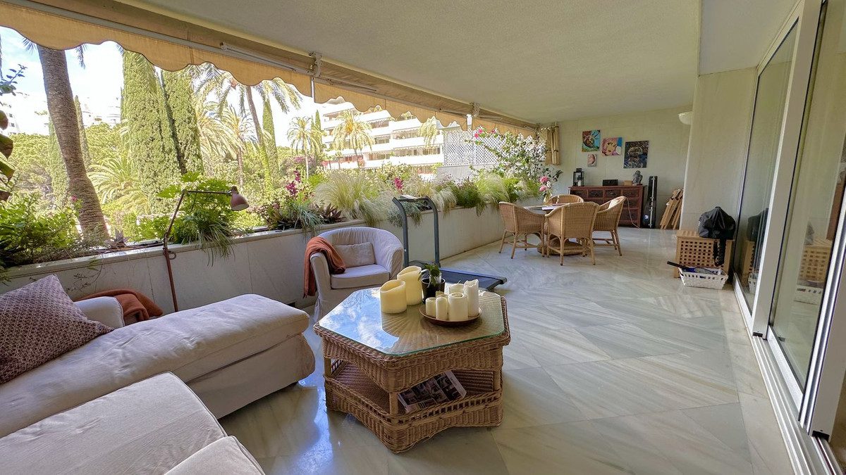 Amplio apartamento en la segunda linea del Paseo Maritimo de Marbella. Precioso y muy privado apartamento en prestigioso complejo situado en el centro de Mabrella, en la segunda linea de la playa y el famoso Paseo Maritimo. El complejo ofrece preciosos jardines con dos piscinas uno infantil, seguridad 24 horas y el servicio de consejería. Ademas están constuyendo nuevo gimnacio con SPA. El apartamento ofrece preciosos vistas al jardin y piscina con la orientación Oeste, consta de una entrada que lleva al salón grande con el accesos a la terraza, la cocina reformada con el lavadero, el dormitorio principal en suite con el acceso a la terraza, dos otros domritorios con sus baños. Los Baños están reformados. Una propiedad ideal para la inversión, residencia permanente o vacacional. ~