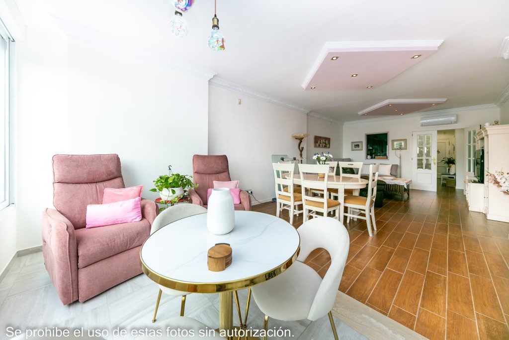 Amplio apartamento en La Cala de Mijas en segunda línea de playa.Se distribuye en amplio hall de entrada, cocina independiente totalmente equipada, amplio salón comedor con terraza ahora incluida en el mismo, 3 dormitorios y 2 baños (1 en suite)Propiedad en buen estado con ventanas climalit, aire acondicionado frio calor y armarios empotrados.Buen mantenimiento de comunidad con ascensor, piscina y jardines.Cuenta con una plaza de aparcamiento opcional en otro edificio a unos 7 minutos andado de la propiedad.Superficie construida: 128,48m2IBI: 561,63€ por año. Comunidad: 486€ por semestre (81€/mes)Año de construcción: 2000.Distancias: Playa: 120mts.Bares/restaurantes: 20mts. Supermercado: 700mts.Aeropuerto de Málaga: 30,7km~
