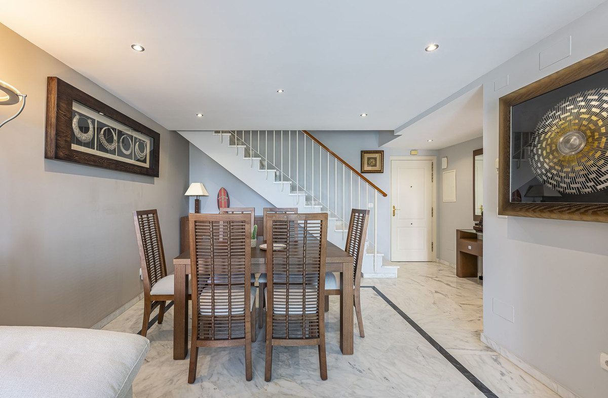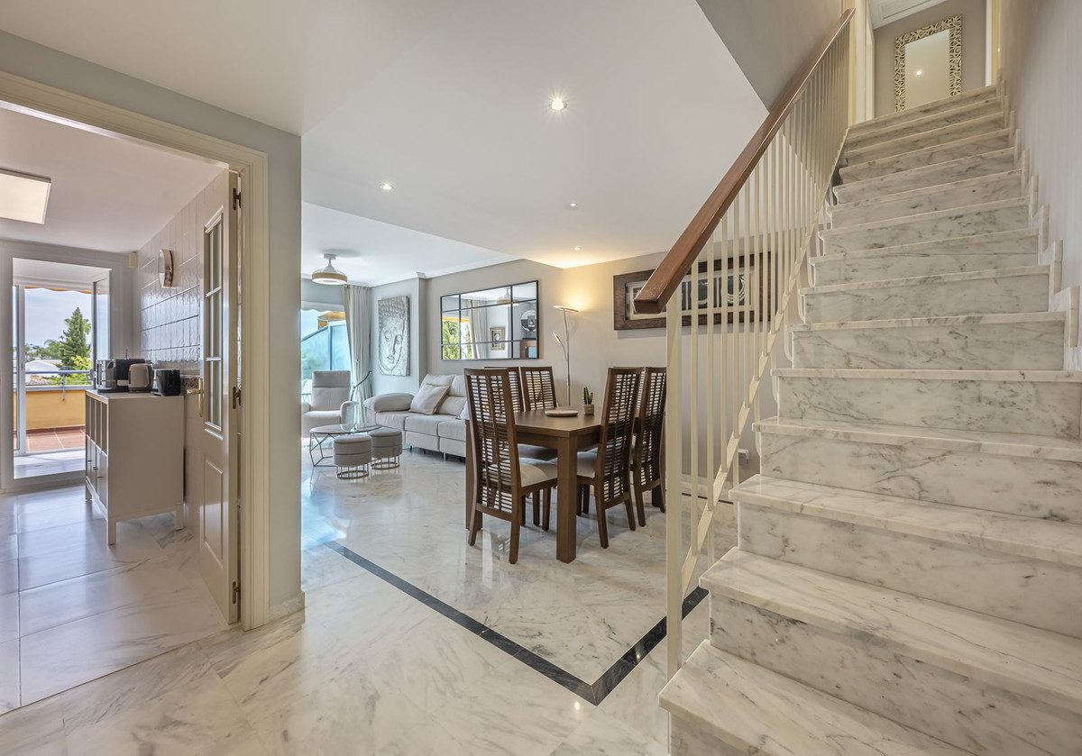 TIENE LICENCIA TURISTICA – BUENA RENTABILIDADExclusiva oportunidad! Un impresionante ático-dúplex con vistas al mar, a tan solo unos pasos de la playa en la prestigiosa Bahía de Marbella. Descubre el encanto de esta propiedad en una de las zonas más privilegiadas de Marbella. Esta vivienda esta distribuida en dos plantas, ofrece un diseño excepcional y comodidades de lujo! En la planta principal, te da la bienvenida un amplio salón-comedor que se abre a una terraza soleada con vistas al mar y a los jardines, una cocina independiente totalmente equipada con electrodomésticos modernos junto con u lavadero y un aseo para invitados, completan este nivel. En la segunda planta, se encuentra la habitación principal con un baño reformado en suite y una terraza privada que ofrece vistas impresionantes al mar, un rincón perfecto para disfrutar de la tranquilidad y la belleza del entorno. Además, dos espaciosas habitaciones con armarios empotrados que comparten otra gran terraza con vistas abiertas al mar y a la montaña, junto con un moderno baño completo equipado con ducha. La propiedad está equipada con aire acondicionado frío/calor para garantizar el confort en cualquier época del año. Con una ubicación inmejorable en una exclusiva urbanización con piscinas comunitarias y jardines muy bien cuidadas. A unos pasos caminando a uno de los mejores playas de Marbella! Construidos Total: 140,28m2 Año de Construcción: 2002 Gastos de comunidad: 220€/ mes IBI: 1.200€ ~