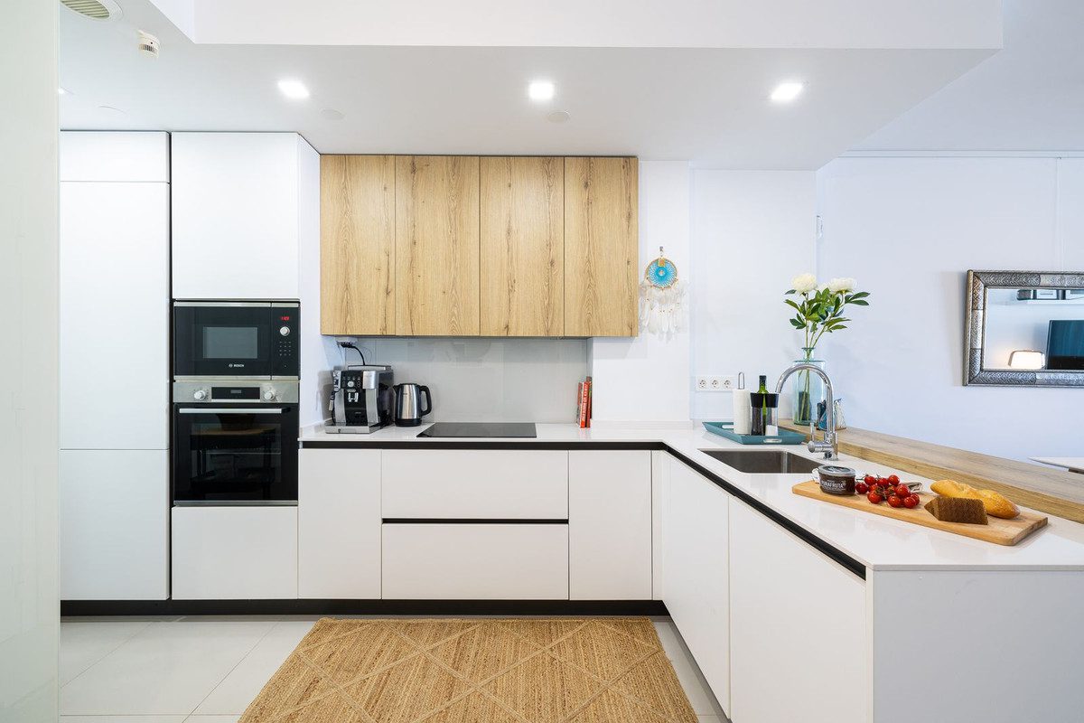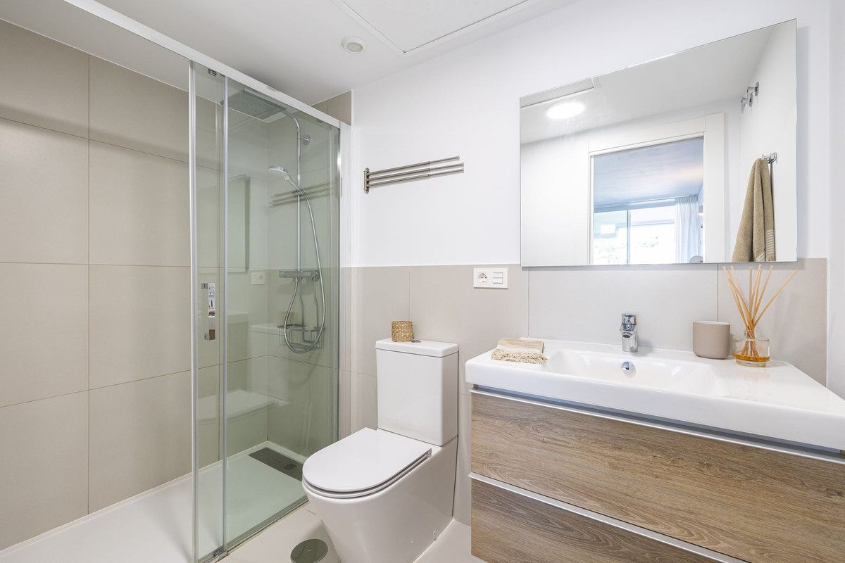 Increíble apartamento de dos dormitorios en planta baja elevada con jardín privado en el popular edificio de apartamentos Las Palmeras 25, a sólo 400 m del mar y junto a todos los servicios.El apartamento tiene un gran jardín de 48m2 con jacuzzi y zona de barbacoa. Además tiene una terraza privada de 20m2 con cortinas de cristal para disfrutarla durante todo el día. El apartamento se encuentra a 9,5 metros de altura desde el nivel de la calle, por lo que no parece un apartamento con jardín en la planta baja. Tiene excelentes vistas abiertas de algunas pintorescas casas españolas y puede disfrutar del sol de la mañana en su propio jardín y organizar fiestas en la calidez del jacuzzi doble.El apartamento tiene dos amplios dormitorios y dos baños. La cocina abierta está equipada con electrodomésticos y muebles de alta calidad y el salón y el dormitorio principal se abren a la gran terraza acristalada. La propiedad cuenta con un sistema de calefacción y refrigeración y puedes controlar la temperatura con el sistema AirZone en cada habitación. Ahora se están instalando paneles solares individuales en el techo comunitario, lo que hace que esta propiedad sea aún más eficiente energéticamente. También hay un sistema domótico de inteligencia del hogar, que incluye, por ejemplo, detector de fugas de agua y alarma contra incendios. Los pavimentos son de Saloni y los electrodomésticos de cocina de Bosh.La ubicación del apartamento es excelente. Tienes el supermercado Mercadona y el centro de raquetas de Benalmádena justo al lado, y todos los restaurantes y servicios que la Avenida de Las Palmeras puede ofrecer y a solo 2 minutos a pie. La playa está a sólo 400 metros y puedes caminar hasta la estación de tren de Arroy en unos 10 minutos. ¡Qué gran ubicación!Este complejo de apartamentos de lujo fue construido en 2020 y cuenta con elementos de lujo como gimnasio comunitario, sauna y una elegante zona de piscina. La prestigiosa promotora construye en El Higuerón y este es su único edificio de lujo en el centro de Benalmádena.La propiedad cuenta con dos plazas de aparcamiento subterráneo privado y un trastero.~