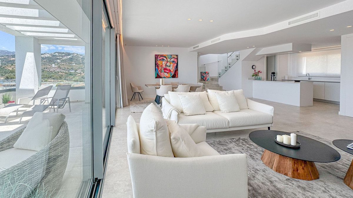 Ático dúplex contemporáneo con terraza y solárium, ambos con vistas panorámicas al mar Mediterráneo y rodeados por los fairways del campo de golf de Santa ClaraEl ático con orientación oeste en el campo de golf de Santa Clara le fascinará con sus pintorescas puestas de sol. Los ventanales panorámicos de suelo a techo de la sala de estar de planta abierta con comedor y cocina totalmente equipada le ofrecen una vista fantástica de las montañas y el Mediterráneo desde todos los ángulos. La terraza de 29 m2 frente a la sala de estar combina a la perfección el área interior con el área exterior, creando un ambiente de vida extremadamente espacioso y aireado. En el mismo nivel se encuentra el dormitorio principal con vistas al mar y baño en suite con bañera y ducha, así como un vestidor. También hay dos dormitorios más que comparten un baño familiar con una amplia ducha y un aseo de invitados. Lo más destacado es la magnífica azotea de 110 m2 con vistas panorámicas, que le ofrece muchas posibilidades para eventos sociales con su familia y amigos.Dentro del exclusivo complejo privado puede disfrutar de amplias instalaciones comunes para su relajación y ejercicio. Entre ellas se encuentran amplios jardines mediterráneos con 4 grandes piscinas al aire libre, tumbonas y camas chill-out, una zona lounge bar al aire libre, un spa con sauna, baño de vapor, piscina cubierta y gimnasio, así como una cafetería y un salón de coworking.- Incluye 2 plazas de aparcamiento en el garaje subterráneo y 1 trastero privado- Calefacción por suelo radiante en toda la propiedad y aire acondicionado (frío/calor)- Una casa de ensueño para vivir, trabajar y pasar unas relajantes vacaciones- Ático ideal en el sur para parejas y familias- Ubicación perfecta para golfistas- Lista para entrar a vivir de inmediatoFeedback geben~