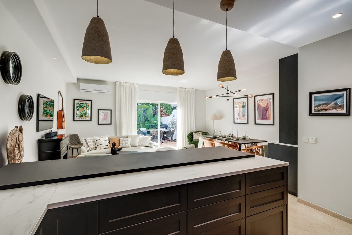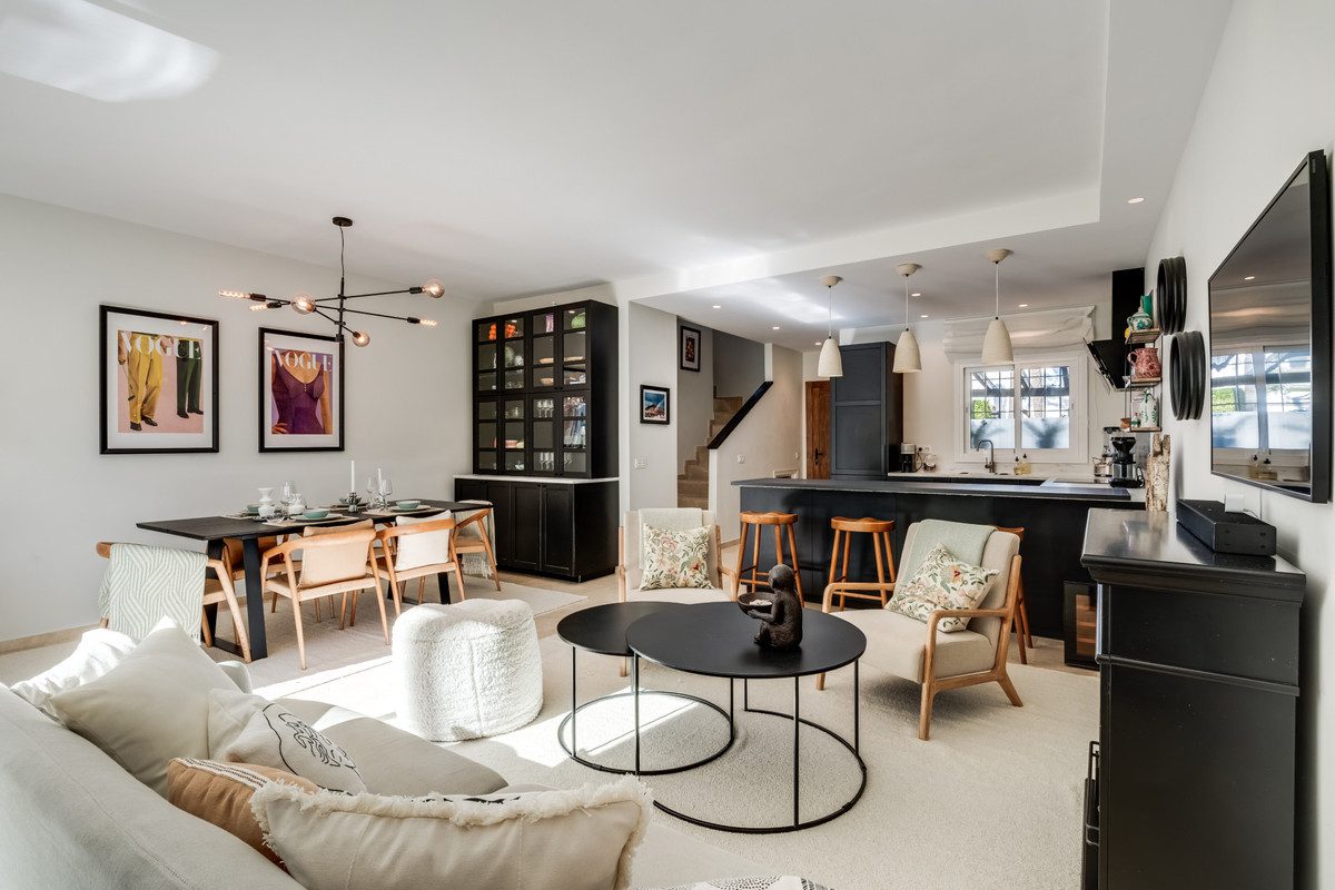 Preciosa casa adosada de tres dormitorios se encuentra en Los Naranjos Country Club, una de las zonas más populares de Nueva Andalucía. Es parte de una comunidad segura y cerrada con seguridad las 24 horas. El barrio ofrece fantásticas características, incluyendo dos grandes piscinas, y pista de tenis y el famoso restaurante Chez Philippe dentro de la urbanización.La planta baja ofrece un luminoso y abierto salón y comedor con una cocina moderna y totalmente equipada. Grandes puertas correderas abiertas a una amplia terraza, perfecta para relajarse o entretener. También hay un aseo de invitados en este nivel.En la segunda planta se encuentran dos confortables dormitorios, ambos con baño en suite y armarios empotrados.La tercera planta está dedicada al dormitorio principal, con baño en suite, armarios empotrados y terraza privada.Esta casa combina estilo moderno, excelentes comodidades, y una ubicación privilegiada para disfrutar del lujoso estilo de vida de Marbella.~