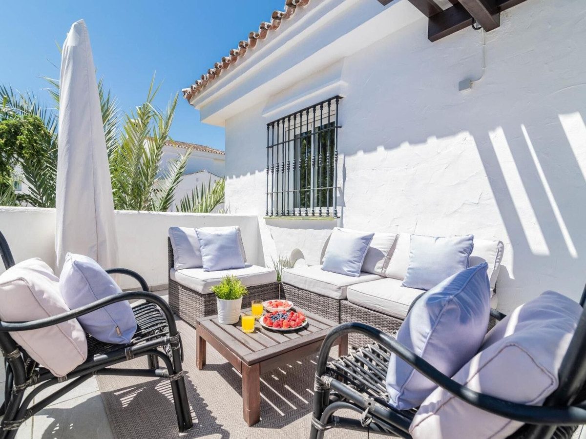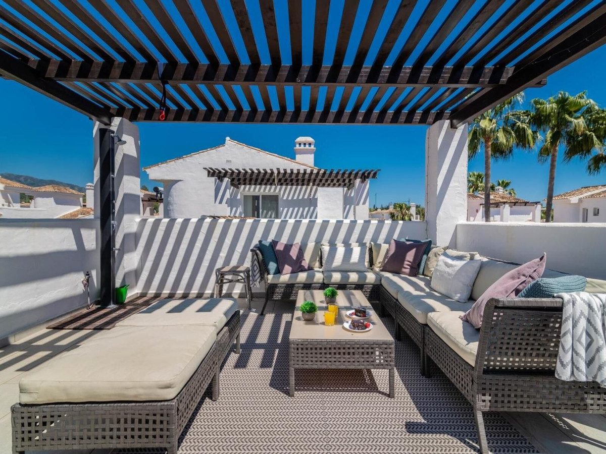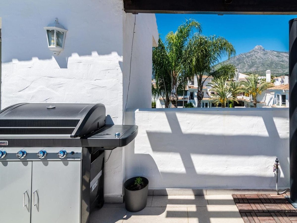 Bienvenido a esta excepcional ático en esquina ubicado en el corazón de la codiciada zona de Los Naranjos de Marbella (Nueva Andalucía). Esta exclusiva propiedad ofrece dos amplias terrazas, perfectamente posicionadas para aprovechar el soleado clima de Marbella y rodeadas de un exuberante jardín.El ático se encuentra en la segunda planta de una comunidad cerrada y bien mantenida, sin ascensor, pero con una excelente distribución que se extiende a lo largo de dos plantas. En el nivel de entrada, encontrará dos luminosos y espaciosos dormitorios, así como un baño elegante y amplio con ducha. La cocina de concepto abierto está completamente equipada y se conecta con el espacioso salón, que ofrece acceso directo a una de las grandes terrazas orientadas al sur. Aquí podrá disfrutar de los cálidos rayos del sol y de la tranquila atmósfera durante todo el año. Además, dispone de un práctico trastero y una lavandería independiente para mayor comodidad en esta planta.En la planta superior, le recibe la magnífica terraza en la azotea, ¡un verdadero punto culminante! Este espacio cuenta con una acogedora ducha exterior y una zona de salón que ofrece una vista inigualable de la icónica montaña de La Concha, el brillante área de la piscina y los bien cuidados jardines. Este es el lugar perfecto para relajarse al sol o disfrutar de una comida en un entorno maravilloso.La propiedad está equipada con aire acondicionado en toda la vivienda, así como ventanas de doble acristalamiento para asegurar un clima interior cómodo durante todo el año.En la comunidad hay amplias plazas de aparcamiento, que también cuenta con vigilancia por cámaras 24/7 para mayor seguridad. Una parada de autobús se encuentra convenientemente ubicada justo al lado de la comunidad. La amplia piscina de la comunidad están a su disposición durante todo el año, asegurando que siempre pueda darse un refrescante baño. El ático se vende completamente amueblado.Este ático está ubicado en una de las zonas más deseables de Marbella, conocida por sus hermosos, tranquilos y exuberantes paisajes, así como por su ambiente residencial exclusivo. Aquí encontrará el equilibrio perfecto entre privacidad y cercanía a todo lo que pueda desear. Restaurantes, tiendas, cafeterías y las canchas de pádel/tenis están a poca distancia a pie. Los entusiastas del golf también apreciarán la proximidad a algunos de los campos de golf más prestigiosos de Marbella. El puerto de Puerto Banús, de fama mundial, y la playa dorada están a solo 15 minutos a pie.Este hogar está listo para entrar a vivir y perfectamente ubicado en una zona tranquila y segura, a poca distancia a pie de todo. ¡No pierda esta oportunidad única de reservar una visita a este fantástico ático, un oasis de confort y estilo en una de las zonas más atractivas de Marbella!~