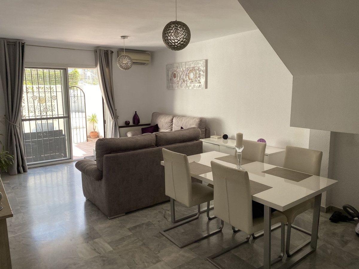 Espaciosa casa adosada familiar en una popular urbanización ubicada entre el histórico pueblo blanco de Mijas y la vibrante localidad costera de Fuengirola.Orientación sureste, con vistas a los cuidados jardines comunitarios.De un vistazo3 dormitorios en total (2 dobles y un amplio dormitorio principal con amplia terraza superior privada)2 baños (uno en suite)Comunidad cerrada y cerradaJunto a serviciosRecibidor que da acceso a un amplio salón-comedor.Chimenea.Patio privado y cerrado para disfrutar del aire libre.Cocina moderna totalmente equipada con espacio para lavadora y amplio espacio de almacenamiento.Características adicionalesAire acondicionado frío/calor en salón y dormitorio principalSuelos de mármol con incrustacionesPersianas de seguridadArmarios empotrados en todos los dormitoriosLas instalaciones comunitarias incluyen una gran piscina tipo laguna y una zona de piscina infantilJardines bien cuidadosZona de juegos infantil cerradaSe vende sin mueblesAparcamiento en la calleLa propiedad se encuentra a poca distancia a pie de una nueva zona comercial con locales de restauración y también está bien comunicada con el transporte público de Fuengirola y Mijas Pueblo.Se recomienda visitarla.Playa/Fuengirola: 4 minutosMijas Pueblo: 7 minutosMálaga: 20 minutosMarbella: 25 minutosSuperficie construida: 154 m²Terraza: 20 m²Terraza superior: 18 m²Construcción: 2001~