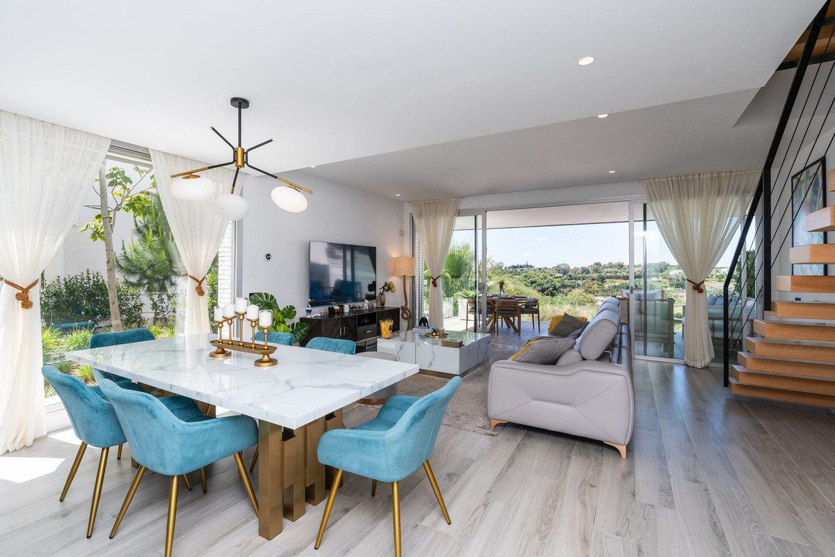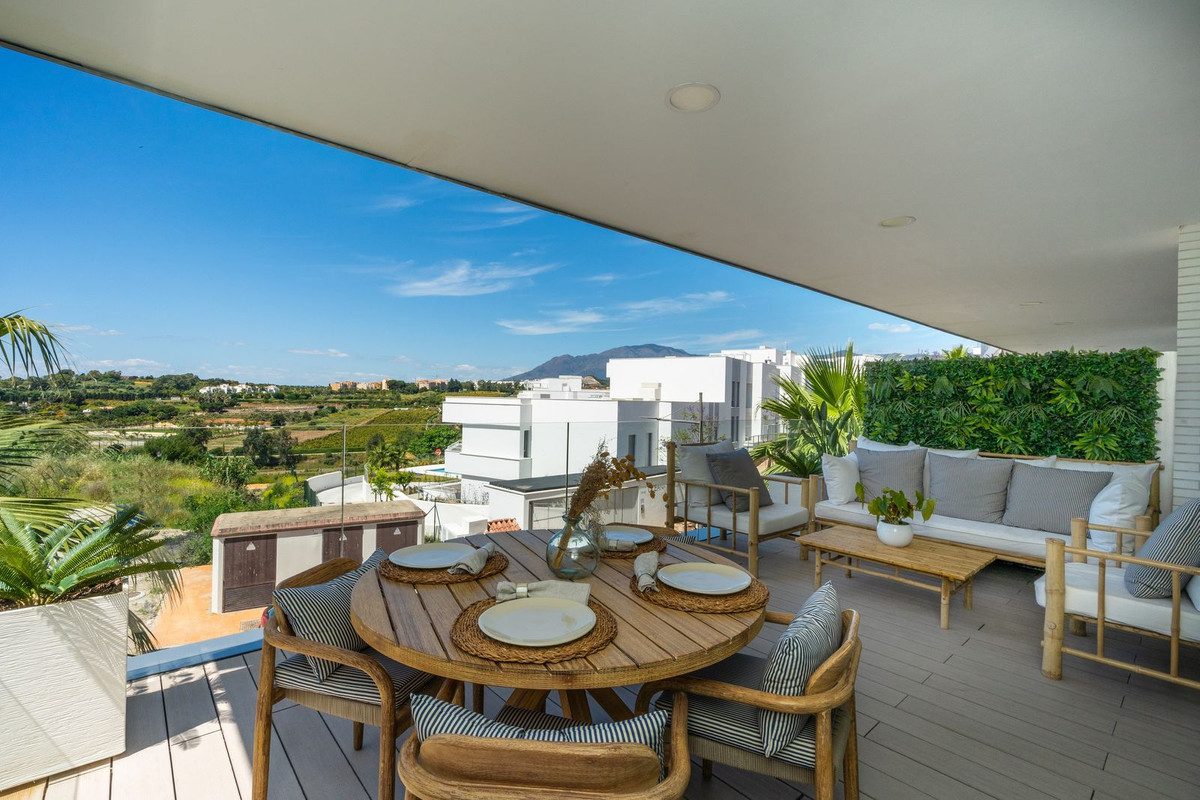 Adosada de Diseño en Esquina con Vistas Panorámicas en Cancelada – Nueva Construcción con Solárium, Terraza y Mejoras de Alta GamaBienvenido a esta impresionante adosada de esquina con vistas panorámicas a las montañas, ubicada en una moderna urbanización de nueva construcción en Cancelada, una de las zonas con mayor crecimiento de Estepona. A pocos minutos en coche de las playas y rodeada de todos los servicios, esta propiedad es una oportunidad única para quienes buscan calidad de vida, diseño contemporáneo y ubicación estratégica.Diseño Moderno y Distribución FuncionalDistribuida en tres plantas más solárium, esta vivienda ofrece una experiencia de vida cómoda y luminosa gracias a su orientación en esquina y a sus ventanales de gran formato que inundan cada estancia de luz natural.En la planta principal, encontramos una cocina de concepto abierto con isla central revestida en cemento proyectado, que aporta un estilo industrial elegante, perfectamente integrada en el salón-comedor. En esta misma planta se ha añadido un armario tipo trastero y un aseo de cortesía. Desde el salón se accede directamente a una amplia terraza con espectaculares vistas a la montaña, ideal para disfrutar de comidas al aire libre o simplemente relajarse al atardecer.Zona de Descanso con Detalles ExclusivosLa segunda planta alberga tres dormitorios. Dos de ellos son habitaciones de invitados con baño compartido en el pasillo. El dormitorio principal cuenta con baño en suite reformado con mamparas de cristal y mueble bajo lavabo, así como un amplio vestidor y un armario doble. La pared divisoria ha sido decorada también con cemento proyectado, manteniendo una coherencia estética de diseño moderno y sofisticado.Solárium Privado con Instalaciones PremiumEn la planta superior, el solárium ofrece un espacio amueblado perfecto para disfrutar de las tardes y noches con vistas panorámicas al atardecer. Incluye toldo para sombra, además de preinstalación de agua y electricidad, ideal para montar una cocina exterior o zona chill-out.Calidades y Extras IncluidosEsta adosada está en estado impecable, ya que es de reciente construcción y ha sido mejorada con materiales y acabados de alta gama:*Iluminación LED en salón*Enchufes e interruptores de diseño en color negro*Cemento proyectado en elementos clave*Mobiliario de diseño incluido en el precio*A/A frio y calor2 plazas de Parking, trastero y Zonas ComunesLa propiedad incluye dos plazas en el parking comunitario, una de ellas equipada con cargador eléctrico Tesla. Además, dispone de un trastero adicional en el edificio contiguo, lo que supone una ventaja ya que la urbanización no dispone de trasteros en cada bloque.Entre las zonas comunes, los residentes disfrutan de piscina al aire libre y acceso exclusivo a un completo club social con:*Gimnasio*Piscina climatizada*Sauna*Zona de coworking*CafeteríaUna adosada única por ubicación, diseño y calidad, perfecta tanto como vivienda habitual como inversión segura en la Costa del Sol.~