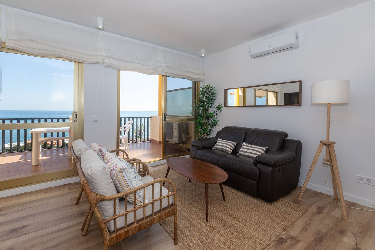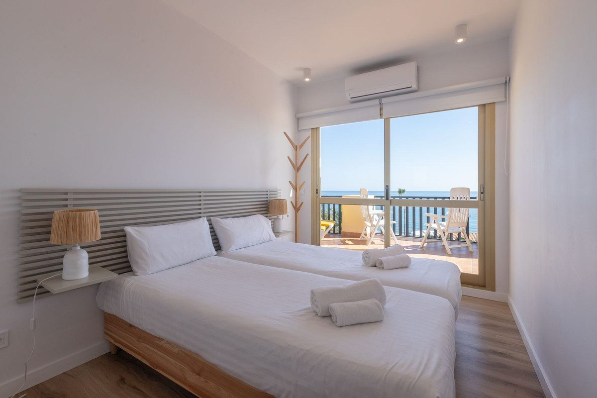 Espectacular ático situado en primera línea de playa con vistas panorámicas al mar. 2 dormitorios, 2 baños y salón, todos con salida a una terraza con maravillosas vistas infinitas al mar. Cocina integrada en el salón completamente equipada. Tiene ascensor que le conduce directamente a la piscina y a la salida a la playa. Recientemente reformado, decoración estilo nórdico, práctico y funcional, muy luminoso, grandes ventanales con salida a una amplia terraza con maravilllosas vistas. Aire acondicionado frio/calor independiente en todas las habitaciones, toldos, persianas electricas, etc. Parking en recinto cerrado, vigilancia privada, andando a centros comerciales.~