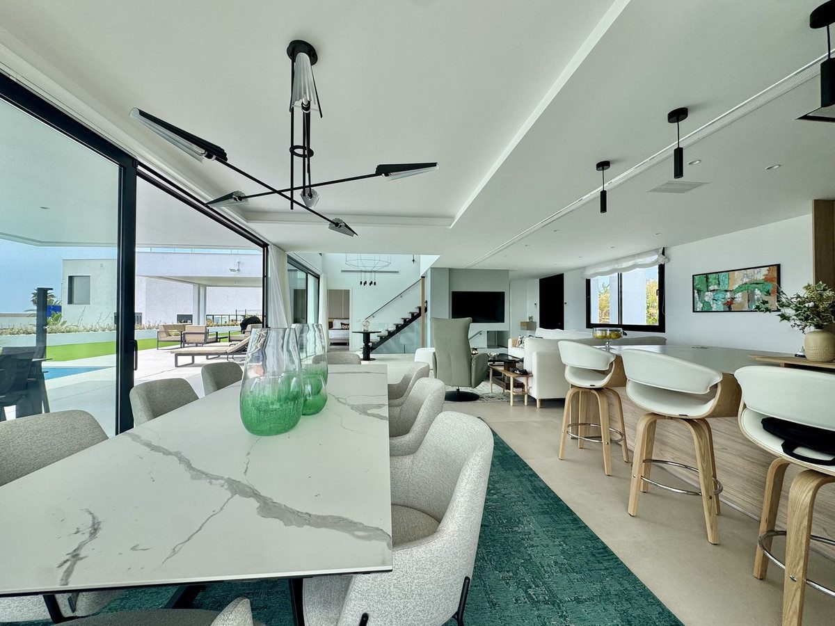 Moderna villa de nueva construcción con 6 habitaciones y 6 baños en suite, distribuida en 3 plantas y ubicada en una zona exclusiva, diseñada para quienes buscan lujo, confort y estilo. Con 460 m² de superficie construida y orientación sureste, esta propiedad destaca por su impresionante arquitectura contemporánea, techos de doble altura y grandes ventanales que inundan de luz natural todos los espacios, creando una conexión perfecta entre interior y exterior.En la planta principal, encontramos una amplia zona de estar de concepto abierto, decorada con gusto minimalista y acabados de alta gama. Desde aquí se accede directamente a la terraza cubierta con zona chill-out y a la piscina completamente privada, ideal para relajarse y disfrutar del estilo de vida mediterráneo. Las terrazas ofrecen impresionantes vistas panorámicas al mar, a la montaña y a la piscina, lo que convierte cada rincón en un espacio único para disfrutar en cualquier momento del día.La villa dispone de aire acondicionado centralizado independiente por zonas, suelo radiante en todos los baños, y una distribución muy funcional que garantiza privacidad y comodidad en cada estancia.En la planta subterránea se encuentra un exclusivo home cinema, perfecto para disfrutar del entretenimiento con la máxima comodidad e intimidad.Una propiedad única, recién terminada, lista para entrar a vivir y disfrutar de una vida de auténtico lujo.~