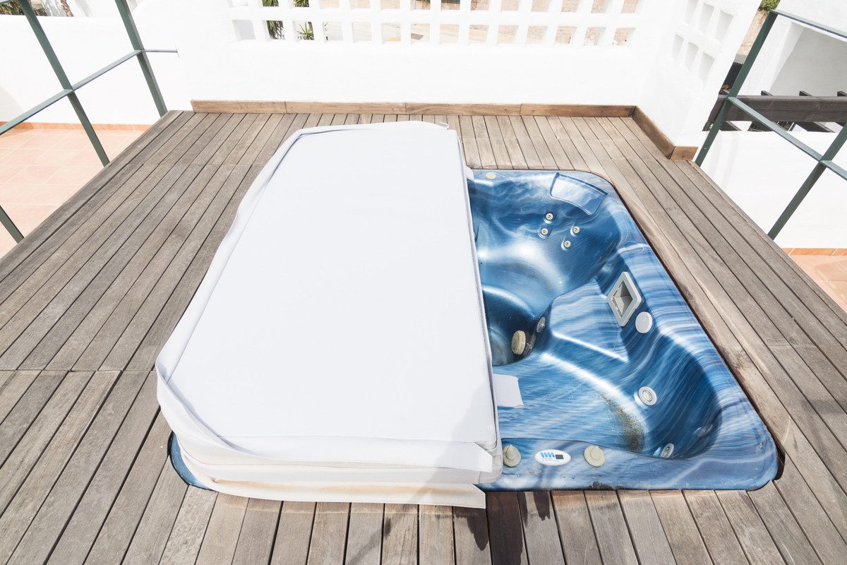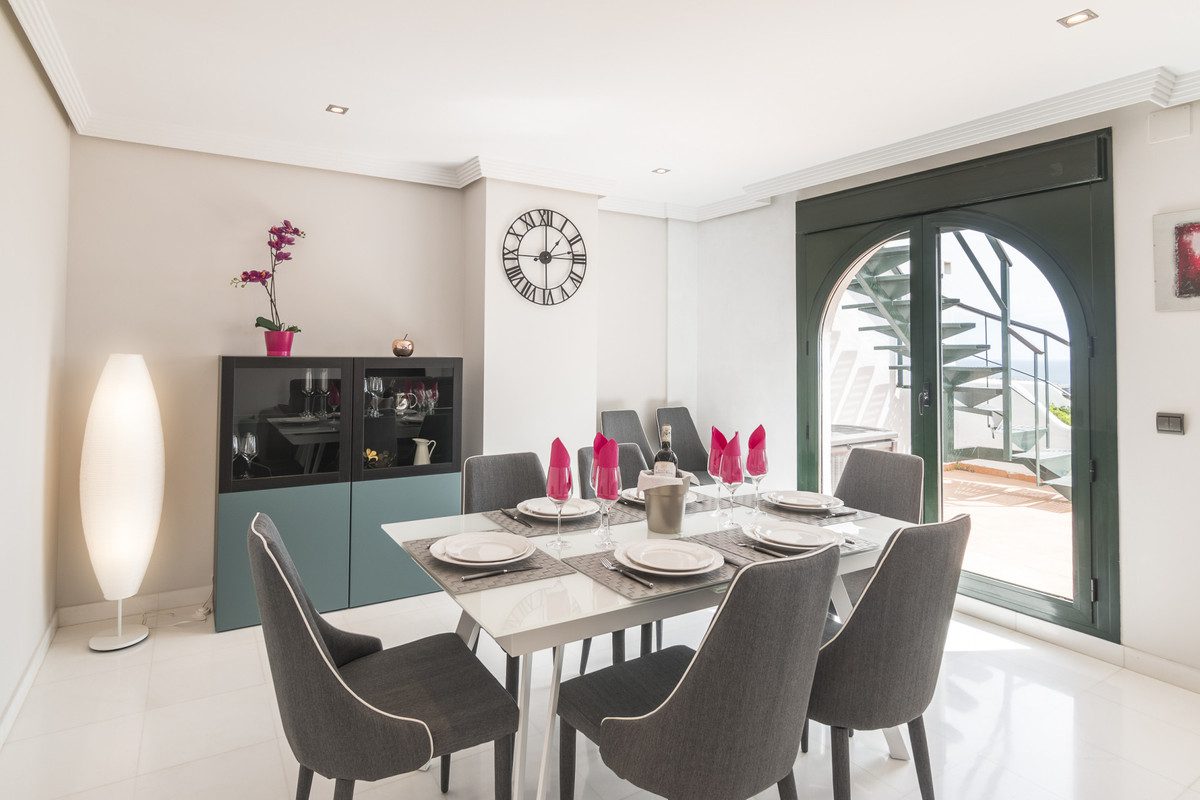 En una agradable urbanización donde los apartamentos están distribuidos en 8 pequeños bloques de tres niveles, este ático ofrece un amplio salón, cocina totalmente equipada con lavadero independiente, 3 dormitorios (uno de ellos en suite con su propio baño y acceso a la terraza), un segundo baño completo y una preciosa terraza de 47 m² que conduce a un solárium de 128 m² con pérgola y jacuzzi, desde donde se disfrutan de unas vistas espectaculares al golf, a las montañas y al mar.Una plaza de aparcamiento subterráneo está incluida en el precio.La residencia, situada en un entorno tranquilo y verde, dispone de piscina comunitaria con zona infantil.Podrá acceder fácilmente al centro de Sabinillas y al Puerto de la Duquesa (10 minutos), así como a Estepona (15 minutos).El aeropuerto de Málaga se encuentra a 60 minutos.~