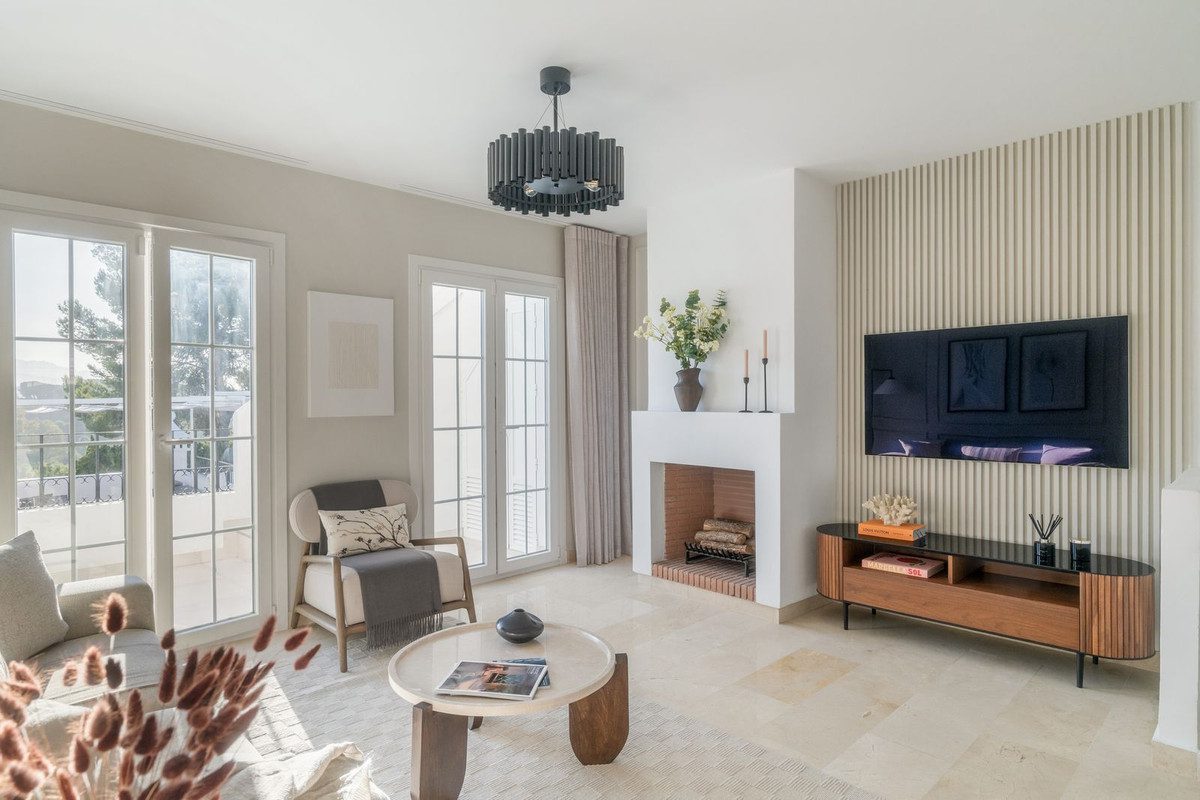 Casa Adosada con Estilo y Vistas Panorámicas en Aloha Pueblo, Nueva AndalucíaUbicada en el corazón de la prestigiosa comunidad de Aloha Pueblo, en Nueva Andalucía, esta casa adosada cuidadosamente renovada (reformada en 2024) ofrece una combinación armoniosa de la arquitectura tradicional andaluza con un estilo de vida contemporáneo.Con unas vistas impresionantes a la emblemática montaña de La Concha y al campo de golf de Aloha, la vivienda se encuentra en una de las zonas más codiciadas de Marbella.Distribuida en tres niveles, la propiedad cuenta con varias zonas exteriores pensadas para el descanso y el entretenimiento. Una terraza en la planta principal es ideal para disfrutar del café al amanecer o para comer al aire libre con vistas panorámicas. La amplia azotea ofrece un oasis privado para tomar el sol o un espacio perfecto para reuniones al atardecer bajo el cielo mediterráneo.En el interior, la planta principal presenta un espacio diáfano y luminoso de salón-comedor con una acogedora chimenea como punto focal. La cocina, moderna y completamente equipada, destaca por su isla con caída de agua y mobiliario de diseño actual. Grandes ventanales conectan de forma fluida los espacios interiores con los exteriores, creando una atmósfera clara y abierta en todo el hogar.La planta inferior alberga dos dormitorios dobles de generosas dimensiones. El dormitorio principal cuenta con un baño en suite, equipado con ducha a ras de suelo y un lavabo doble, ofreciendo tanto confort como funcionalidad. El segundo dormitorio dispone de acceso directo a un encantador patio privado, añadiendo un toque de tranquilidad exterior. Además, en este nivel se encuentra un amplio baño familiar con ducha, ideal para residentes e invitados.Aloha Pueblo es una urbanización única, inspirada en el encanto de un típico pueblo andaluz. Construida a finales de los años 80, la comunidad se caracteriza por sus calles empedradas, fachadas encaladas, caminos adornados con flores y acogedoras plazas. Combina una estética atemporal con comodidades modernas, como piscina comunitaria, jardines paisajísticos y seguridad 24 horas con vigilancia y personal en el lugar.Los residentes disfrutan de la cercanía a encantadores cafés y restaurantes dentro del complejo, así como a prestigiosos campos de golf como Aloha Golf, Los Naranjos y Las Brisas, todos a pocos minutos. Además, la vibrante vida de Puerto Banús, sus playas, la alta gastronomía, las tiendas de lujo y reconocidos colegios internacionales se encuentran fácilmente accesibles.Ya sea como residencia habitual, casa vacacional con estilo o inversión de alta rentabilidad, esta excepcional propiedad ofrece una oportunidad única para disfrutar del estilo de vida de la Costa del Sol en un entorno verdaderamente pintoresco.~