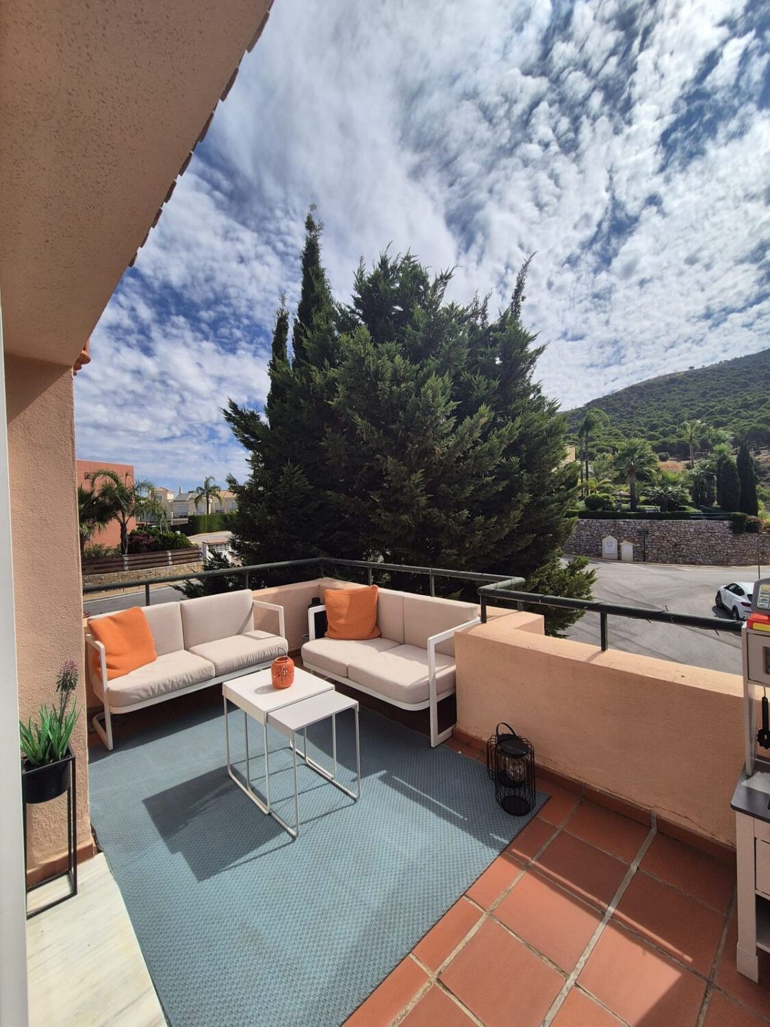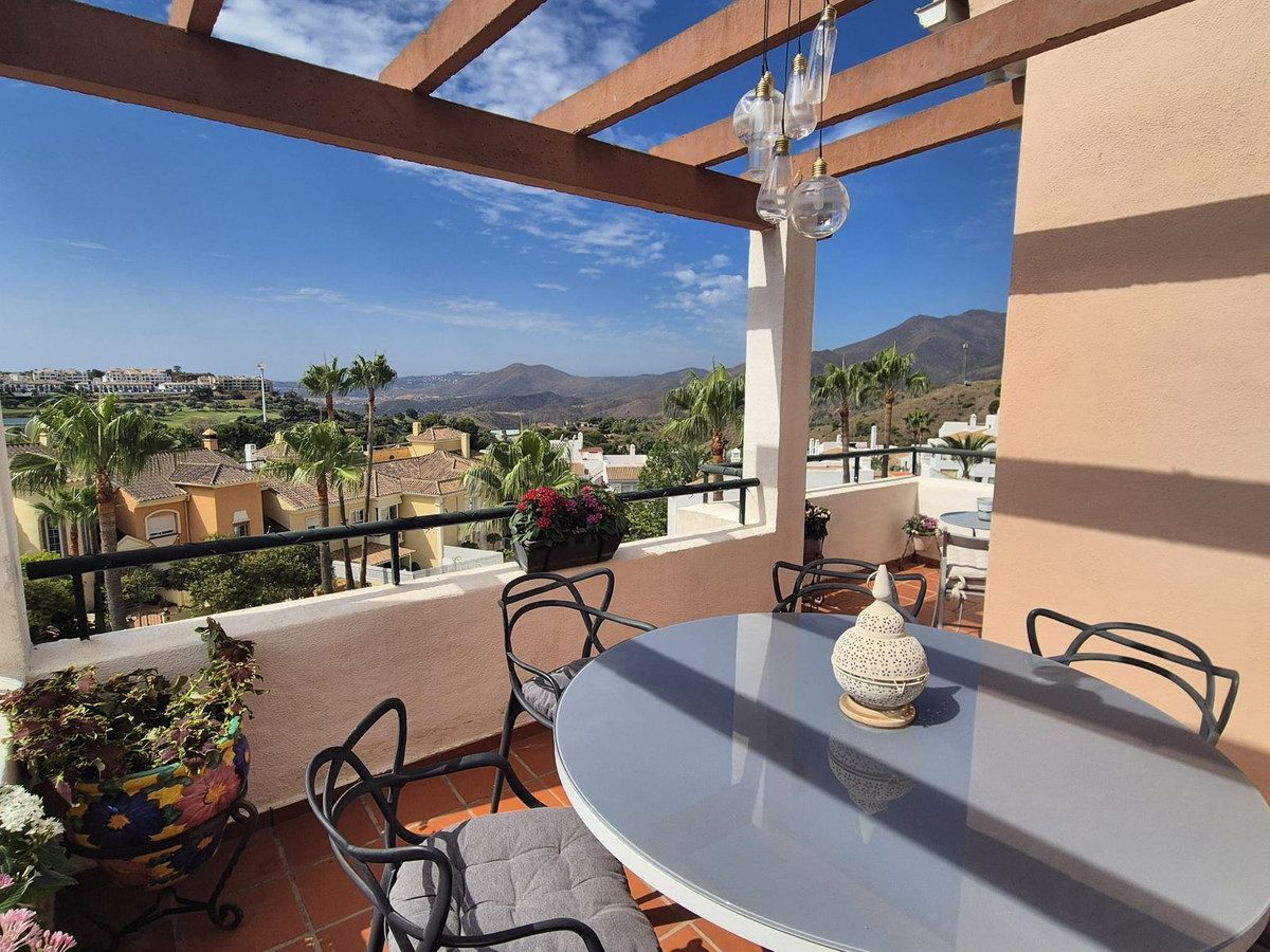 Fantástico ático dúplex esquinero en venta en Pueblo Andaluz con impresionantes vistas al campo de golf de Alhaurín y a las montañas circundantes.Se puede acceder al apartamento por las escaleras o el ascensor desde la entrada principal o por la zona de aparcamiento, donde encontrará una plaza de aparcamiento cubierta y un amplio trastero. Puede elegir entre dos piscinas y jardines bien cuidados. La urbanización se encuentra cerca de la entrada inferior, donde encontrará el hotel y restaurante del campo de golf, otros dos restaurantes y la gasolinera, donde encontrará una tienda de conveniencia y una cafetería.Al entrar al ático, el pasillo a la derecha muestra el dormitorio principal con baño en suite con bañera/ducha combinada y dos lavabos, armarios empotrados y acceso a una de las tres amplias terrazas que ofrece. Junto a este, se encuentra el luminoso salón esquinero con dos grandes puertas francesas que dan a dos amplias terrazas orientadas al sur con impresionantes vistas al campo de golf y a la montaña. La cocina totalmente equipada se encuentra a la izquierda del pasillo y las escaleras que suben al segundo nivel, donde encontrará dos dormitorios, amplios armarios, un baño completo y un solárium con impresionantes vistas. Una fantástica zona de relax para disfrutar de las tardes.Está a solo 5 minutos en coche de Alhaurín el Grande y a 25 minutos de Marbella, el aeropuerto de Málaga y las playas. ¡No se lo pierda!~