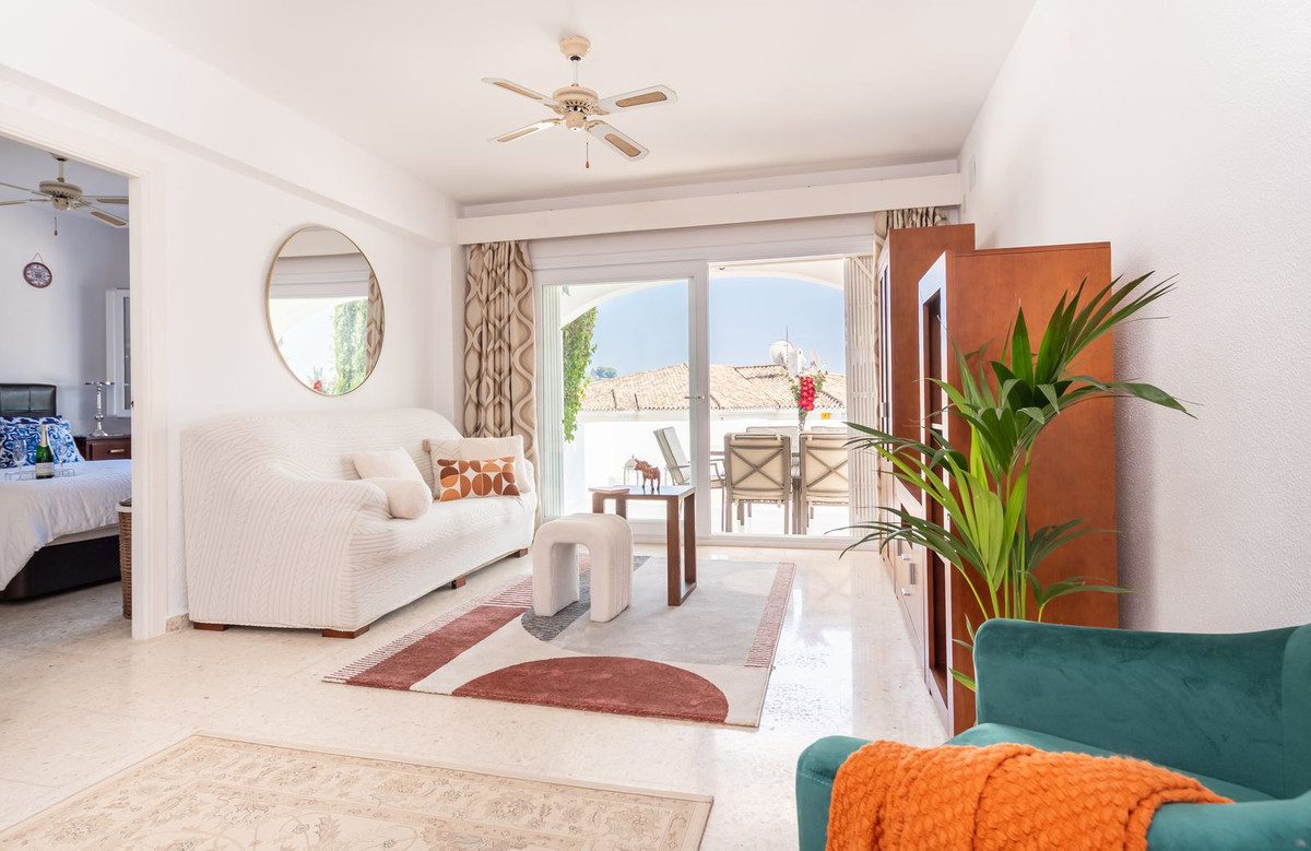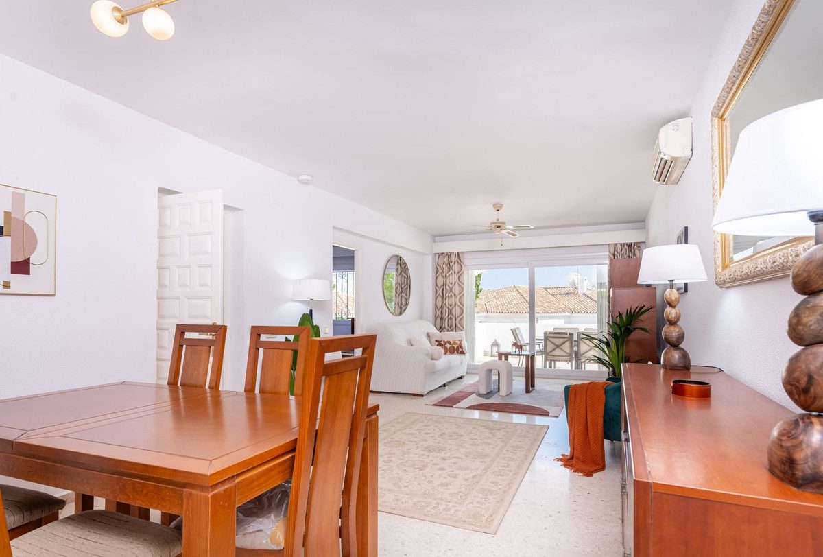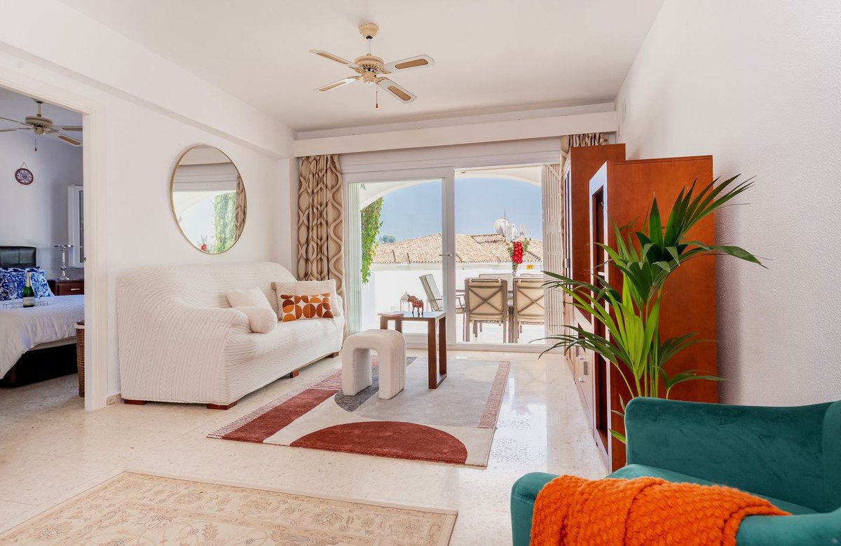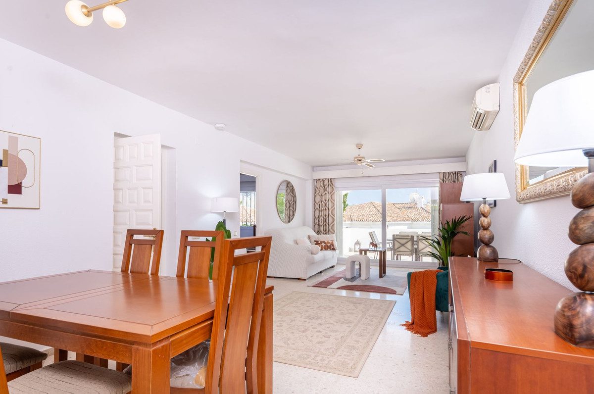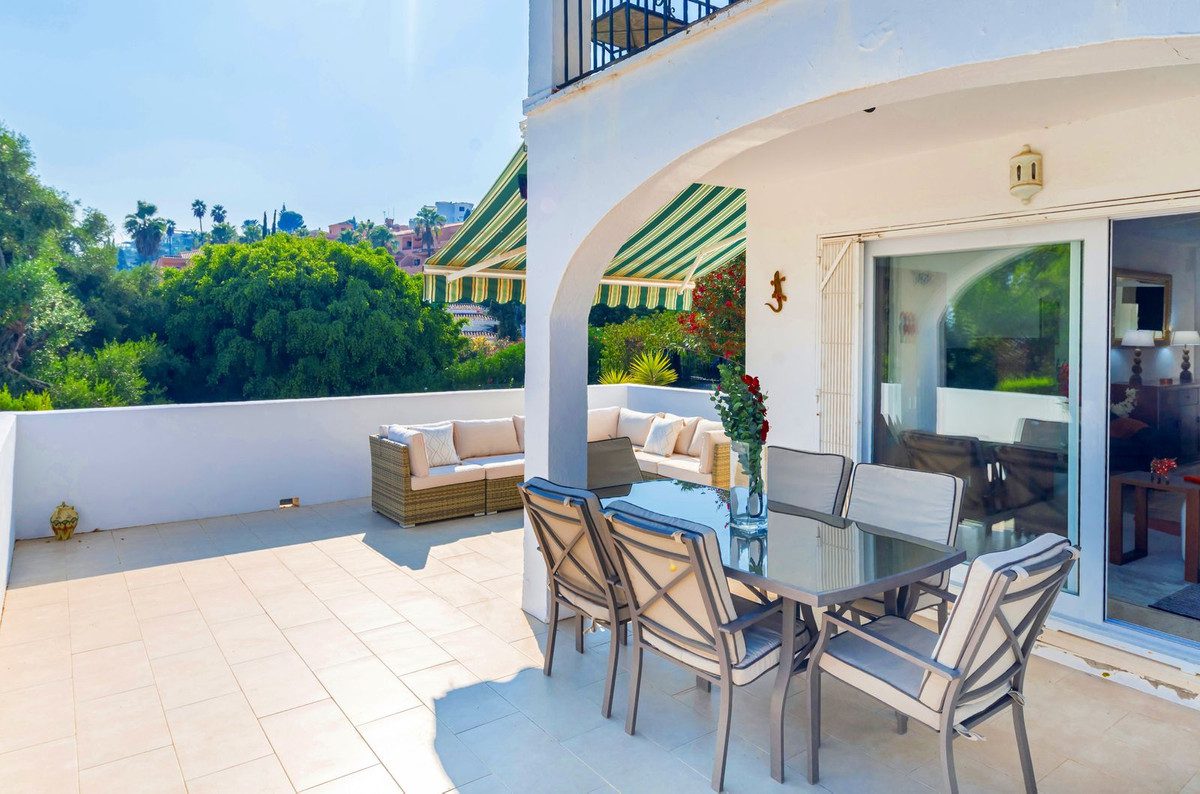 Apartamento esquinero excepcionalmente espacioso y único, con orientación sur y garaje propio en el sótano, situado en la prestigiosa comunidad andaluza de El Paraíso Alto, Benahavís, una zona de excepcional belleza natural y tranquilidad, elegida constantemente por profesionales del sector como una de las mejores opciones residenciales y de golf. Diseñado con magníficos jardines tropicales, ofrece acceso al famoso green del campo de golf de 18 hoyos de El Paraíso Alto.Desde el cuidado entorno de palmeras tropicales de la comunidad, una entrada cerrada con un fabuloso jardín de 60 m² adyacente al apartamento da acceso a la entrada principal de la propiedad.Al entrar, una impecable cocina semiabierta de roble oscuro, completamente renovada y con electrodomésticos de alta gama, se encuentra frente a un espacioso salón-comedor con aire acondicionado y muebles contemporáneos de madera de acacia. Ventanas climatizadas de triple acristalamiento de última generación en todo el apartamento, con aire acondicionado y ventiladores de techo eléctricos, lámparas de alta gama, cortinas a medida, persianas correderas andaluzas y un exquisito suelo pulido original de color blanco crema con efecto nácar. El salón cuenta con amplios ventanales que ofrecen vistas al exquisito entorno residencial andaluz, con una terraza exterior de 30 m², totalmente renovada, tanto cerrada como abierta, ideal para comer, tomar el sol y relajarse, equipada con un toldo. A un jardín adicional a nivel de la terraza se accede desde una entrada a la terraza, construida a medida, con escaleras que conducen directamente al garaje para un coche y a un patio exterior para aparcar otro.El dormitorio principal, con baño en suite y muebles de caoba, ofrece vistas parciales al campo de golf y al entorno andaluz. El baño en suite cuenta con una ducha a ras de suelo notablemente espaciosa.Un largo pasillo privado, al que se accede desde el salón, conduce a un baño de mármol crema claro en impecables condiciones, con bañera y tocador de mármol. El dormitorio doble contiguo para invitados, equipado con dos camas individuales, armarios con paneles dobles y muebles de caoba, ofrece vistas a los senderos comunitarios rodeados de jardines de palmeras y buganvillas.El garaje incluido con la propiedad se encuentra justo debajo del apartamento y ofrece un amplio trastero interior con una pequeña ventana y su propia puerta de garaje.La piscina comunitaria, impecablemente mantenida, ofrece impresionantes vistas al campo de golf y a La Concha, abierta las 24 horas del día, los 7 días de la semana.Todos los muebles y la decoración están incluidos en el precio.Perfecto para golfistas o familias. Ideal para vivir todo el año o para vacaciones.La Casa Club de Golf El Paraíso ofrece un restaurante y un bar con vistas al green del campo de golf, abierto todo el año.A 6 minutos en coche de las exquisitas playas y el Paseo de Costalita, Villa Padierna Club Del Mar y Club de Tenis, y del Centro Comercial Bel Air y Benavista, que ofrece servicios esenciales y una excelente selección de restaurantes internacionales.A poca distancia en coche del famoso casco histórico de Estepona, Marbella, la Milla de Oro y Puerto Banús.Seguridad 24 horas en la zona de El Paraíso Alto Benahavis.Zonas cerradas dentro de la comunidad.Listado exclusivo.Se recomienda visitarlo.~