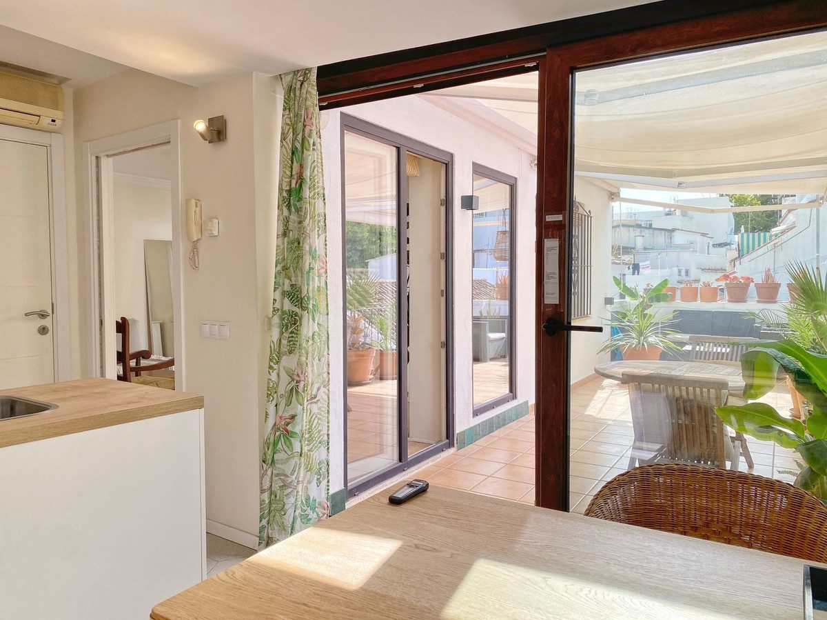 Propiedad única e irrepetible, precioso apartamento tipo Ático de 1 dormitorio, con una gran terraza privada, soleada y bonitas vistas despejadas sobre el casco viejo. Situado en una tranquila calle peatonal del casco antiguo de Marbella, super tranquilo y sin ruidos. El apartamento cuenta con un dormitorio independiente, un cuarto de baño con ducha con ventana al exterior, un acogedor salón y cocina equipada con comedor, ambos con salida directa a una fantástica terraza exterior de 25 m2, donde hay diferentes zonas tanto para relajarse o tumbarse a tomar el sol, como para sentarse a comer en el exterior.La vivienda se encuentra en un excelente estado de conservación, listo para entrar a vivir. Pequeño edificio de sólo 3 vecinos. Adicionalmente hay otra fantástica terraza en la azotea del edificio donde hay una pequeña habitación comunitaria, que en la actualidad se usa como cuarto de limpieza y lavandería de este apartamento. Ideal para uso turístico con una altísima rentabilidad.~