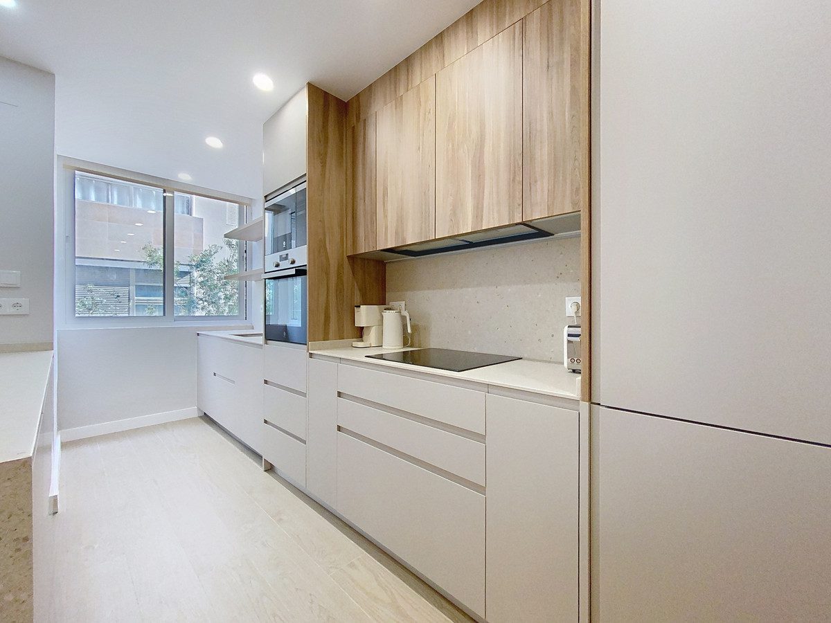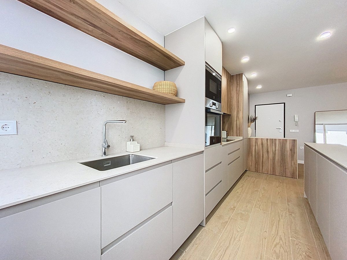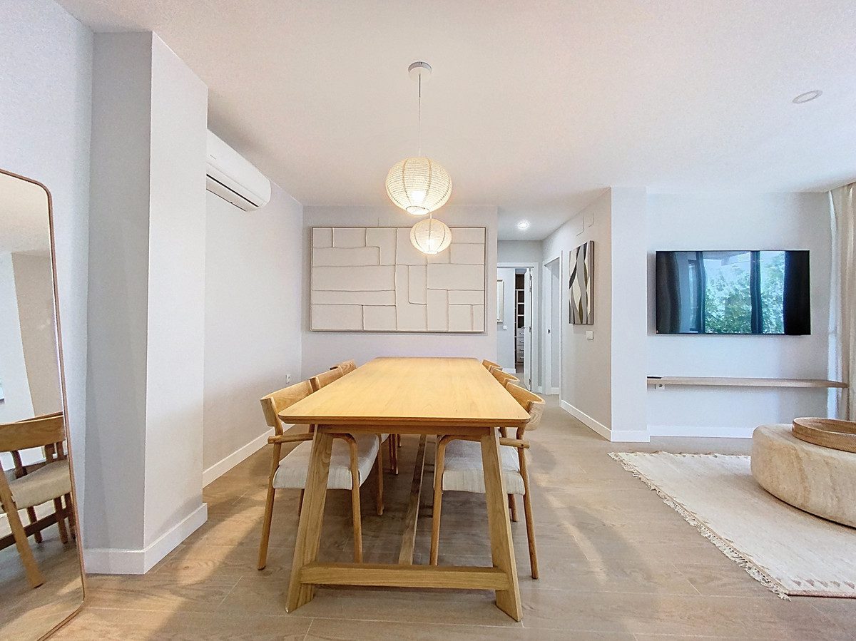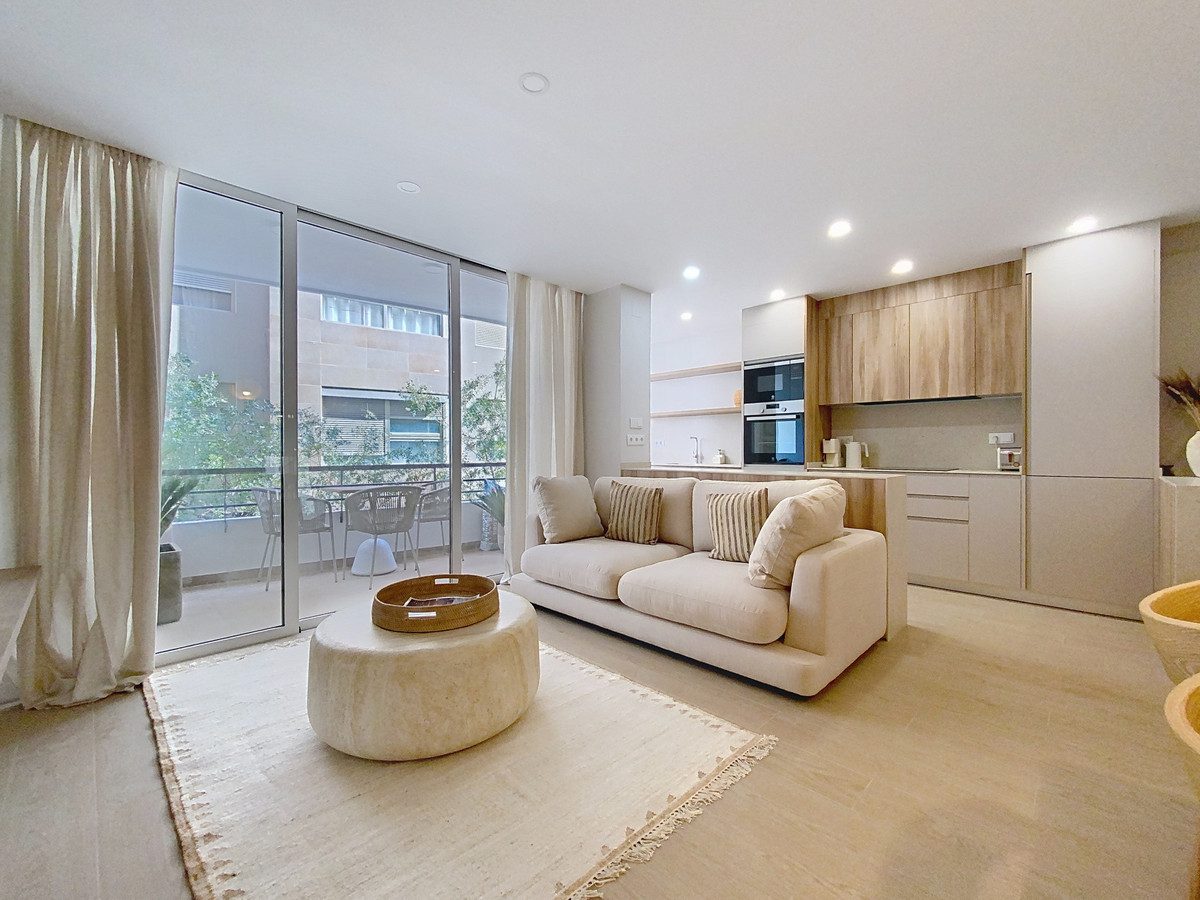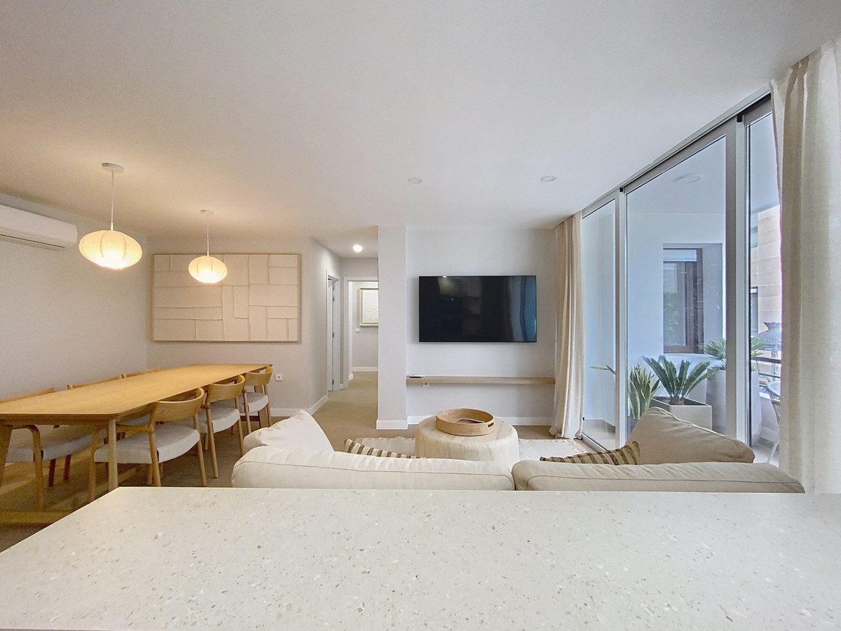 Este apartamento en primera planta, situado en la exclusiva zona de Paseo Maritimo, en el centro de Estepona, destaca por sus vistas laterales al mar y su acceso directo al paseo marítimo. Totalmente reformado y listo para entrar a vivir, la vivienda ofrece una ubicación privilegiada, a escasos metros de la playa y cerca de todos los servicios esenciales como tiendas, restaurantes, colegios y transporte público.La zona principal de la vivienda se compone de una sala de estar de planta abierta con comedor integrado, lo que proporciona un ambiente espacioso y luminoso. El suelo de parquet y los grandes ventanales con puertas de cristal aportan calidez y claridad al espacio. La cocina, completamente equipada y de diseño abierto con península, está integrada en la zona social, facilitando la convivencia y el aprovechamiento del espacio. Desde el salón se accede a una terraza tipo balcón de aproximadamente 7m², ideal para disfrutar de las vistas laterales al mar y del clima de la Costa del Sol.El apartamento cuenta con dos dormitorios, con fácil posibilidad de crear un tercer dormitorio, con armarios empotrados y acabados modernos. El dormitorio principal dispone de un amplio baño privado con ducha de gran tamaño, mientras que el segundo baño también está completamente equipado y mantiene la misma línea de diseño actual. Los acabados incluyen suelos de porcelana en las zonas húmedas y doble acristalamiento en todas las ventanas, garantizando confort y eficiencia.Entre los extras que ofrece la vivienda destacan el aire acondicionado, puerta de entrada blindada, ascensor en el edificio y acceso directo al paseo marítimo. El apartamento se entrega completamente amueblado y en excelente estado, con todos los elementos renovados recientemente. Además, la propiedad se encuentra cerca de todos los servicios urbanos, como comercios, puerto, colegios y restaurantes, lo que facilita la vida diaria en el centro de Estepona, junto al mar.~