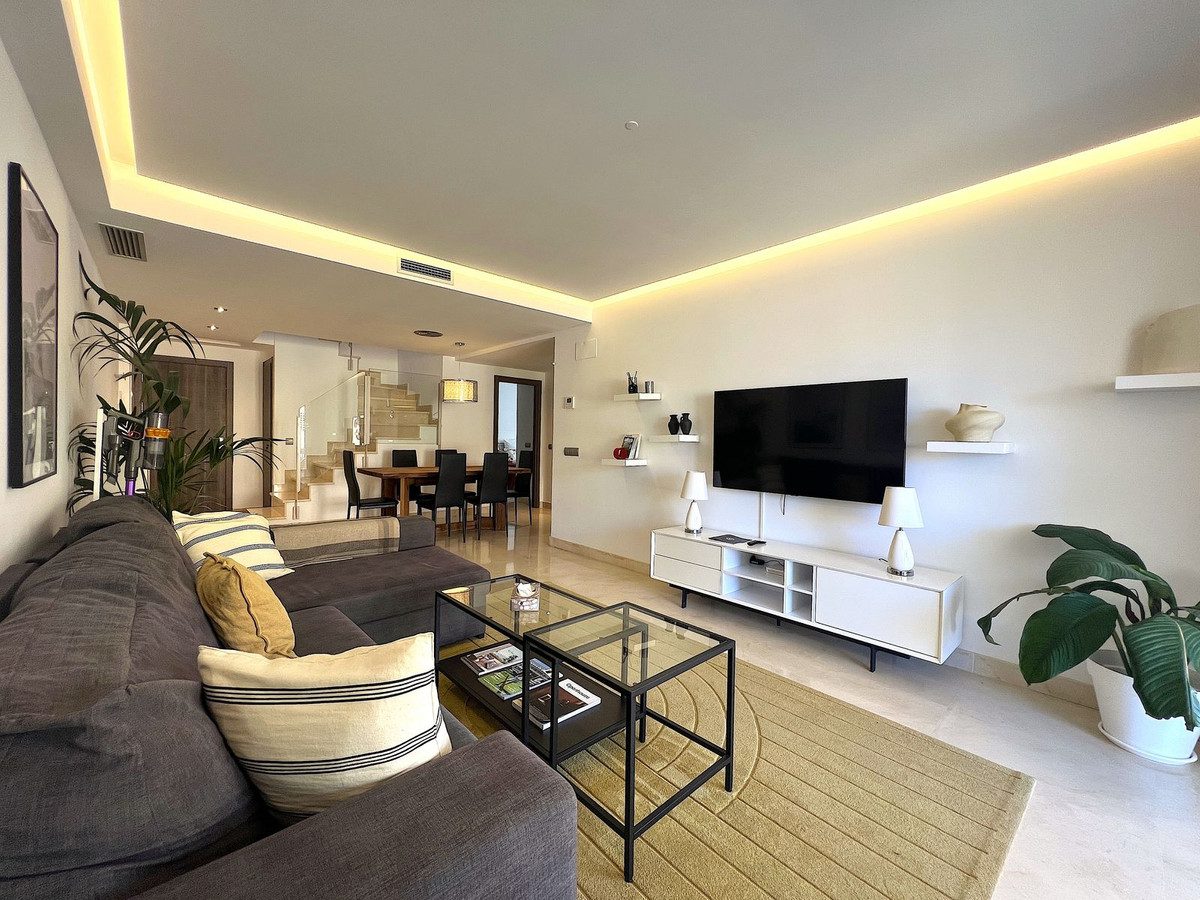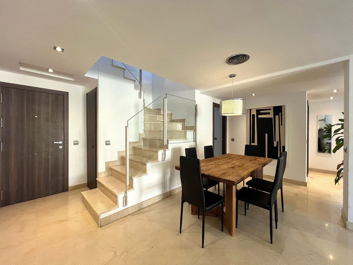 Magnífico apartamento dúplex en tercera planta con vistas a la avenida y a la montaña, ubicado junto a la playa de San Pedro Alcántara (Málaga).La vivienda se distribuye en dos plantas:Primera planta: amplio hall de entrada, luminoso salón-comedor con salida a una agradable terraza, moderna cocina independiente también con acceso a la terraza y bonitas vistas a la montaña. Dispone de tres amplios dormitorios y dos baños completos, uno de ellos en suite.Segunda planta: un dormitorio adicional con acceso a un gran solárium de 112 m2, equipado con pérgolas y zona de barbacoa, ideal para disfrutar del clima mediterráneo.Incluye una plaza de aparcamiento subterráneo con acceso directo a la vivienda.El apartamento forma parte de una bonita urbanización situada a pocos minutos a pie de la playa y del centro de San Pedro Alcántara. El complejo está rodeado de una amplia oferta gastronómica, comercios y todos los servicios necesarios para disfrutar de una vida cómoda y relajada junto al mar.~