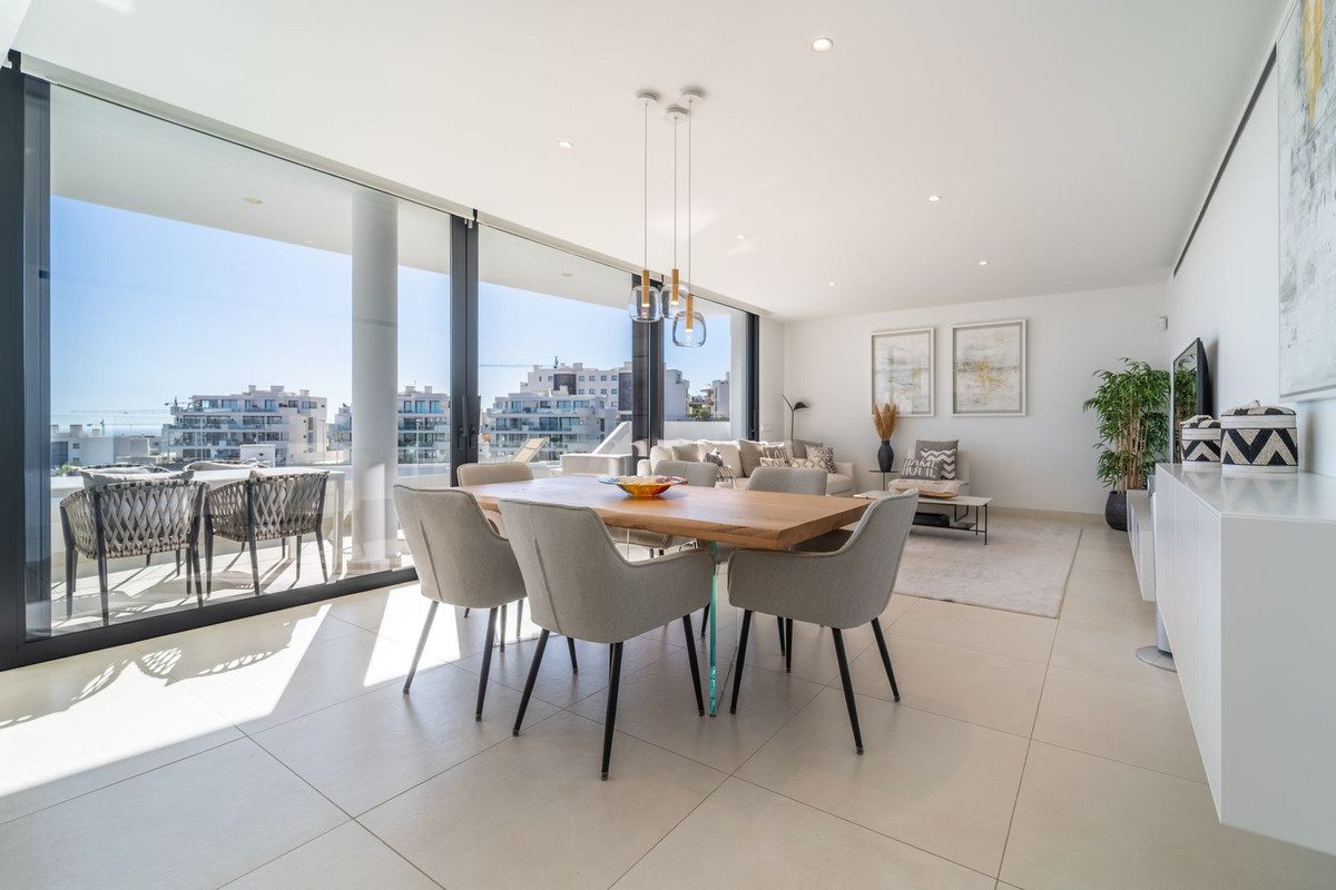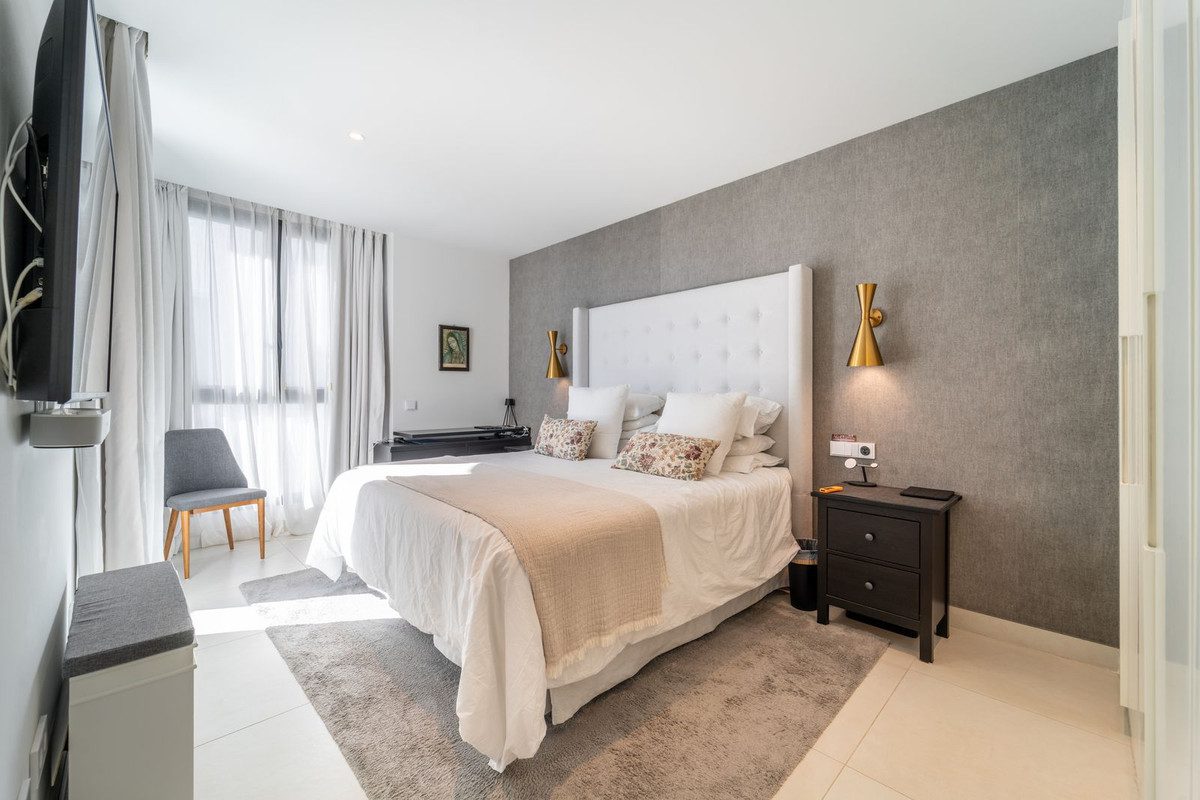 Apartamento de lujo con orientación sur, en la exclusiva urbanización de Higuerón Oeste, con 3 dormitorios, 2 baños, amplio salón comedor, cocina americana totalmente amueblada y equipada con electrodomésticos BOSCH, zona de lavandería con lavadora/secadora, gran terraza de 26m2 con preciosas vistas panorámicas al mar. Dormitorio principal con vestidor, baño ensuite y acceso a una terraza pequeña. Aire acondicionado frío y calor, videoportero, sistema domótico, armarios empotrados en todos los dormitorios y entrada, preinstalación de alarma, suelo radiante en baños. Incluye dos plazas de garaje y un trastero.APARTAMENTO CON LICENCIA TURÍSTICA~