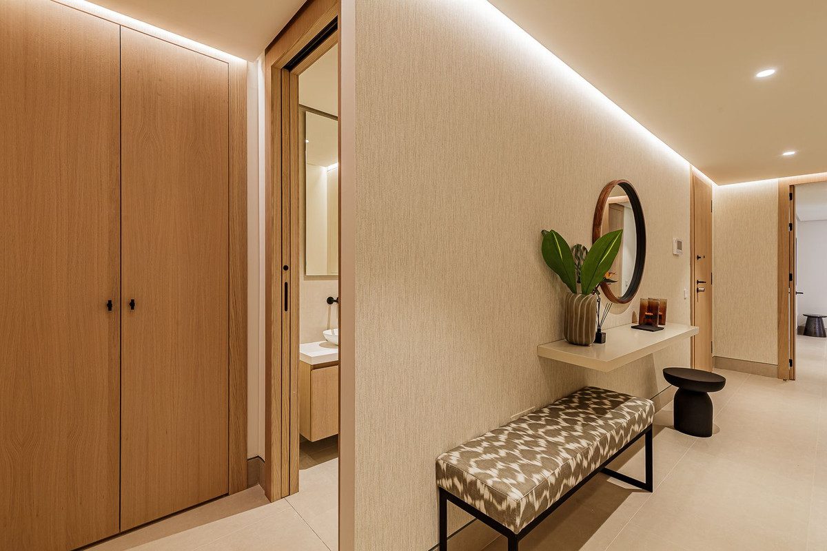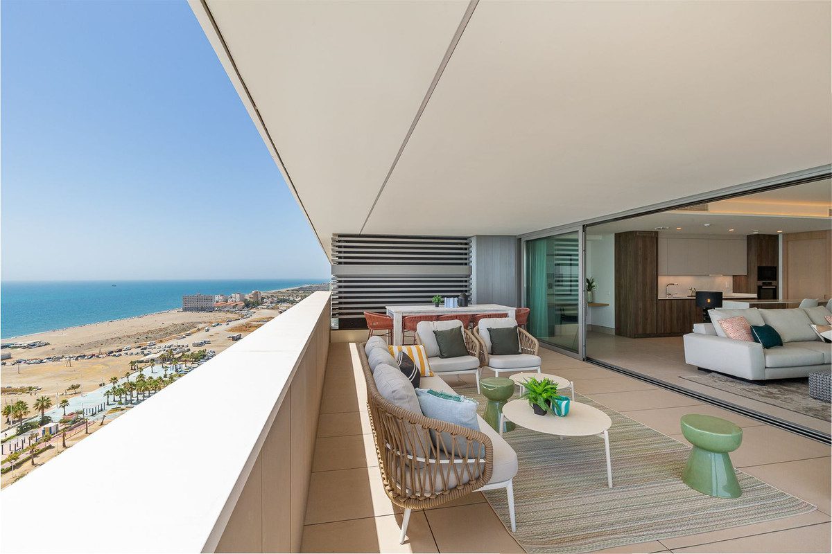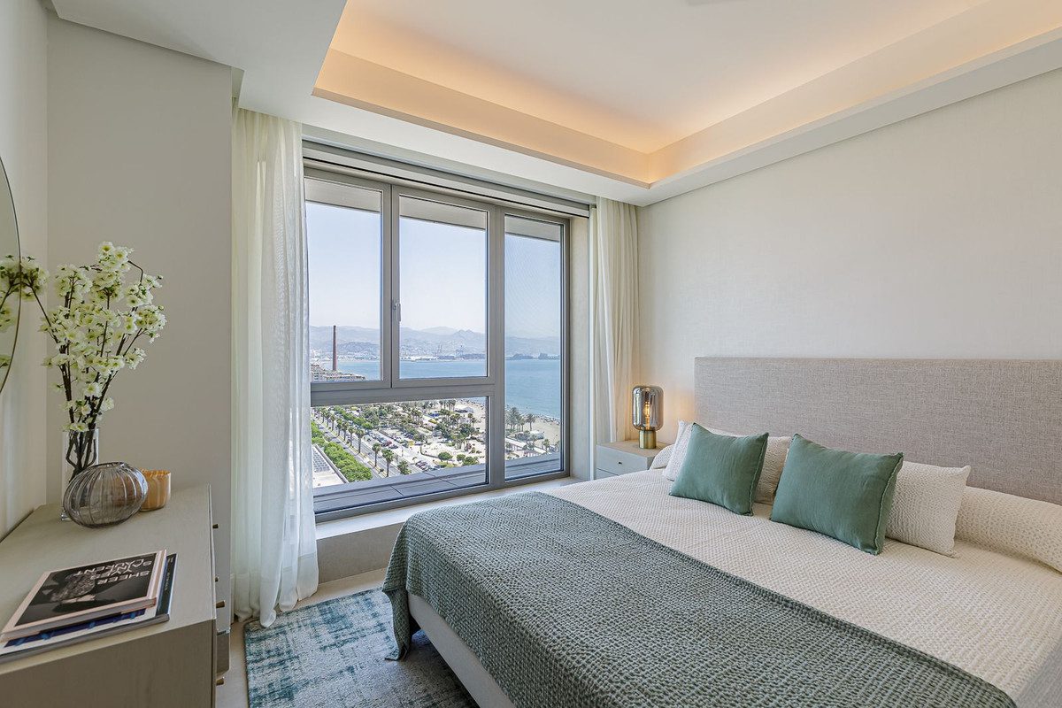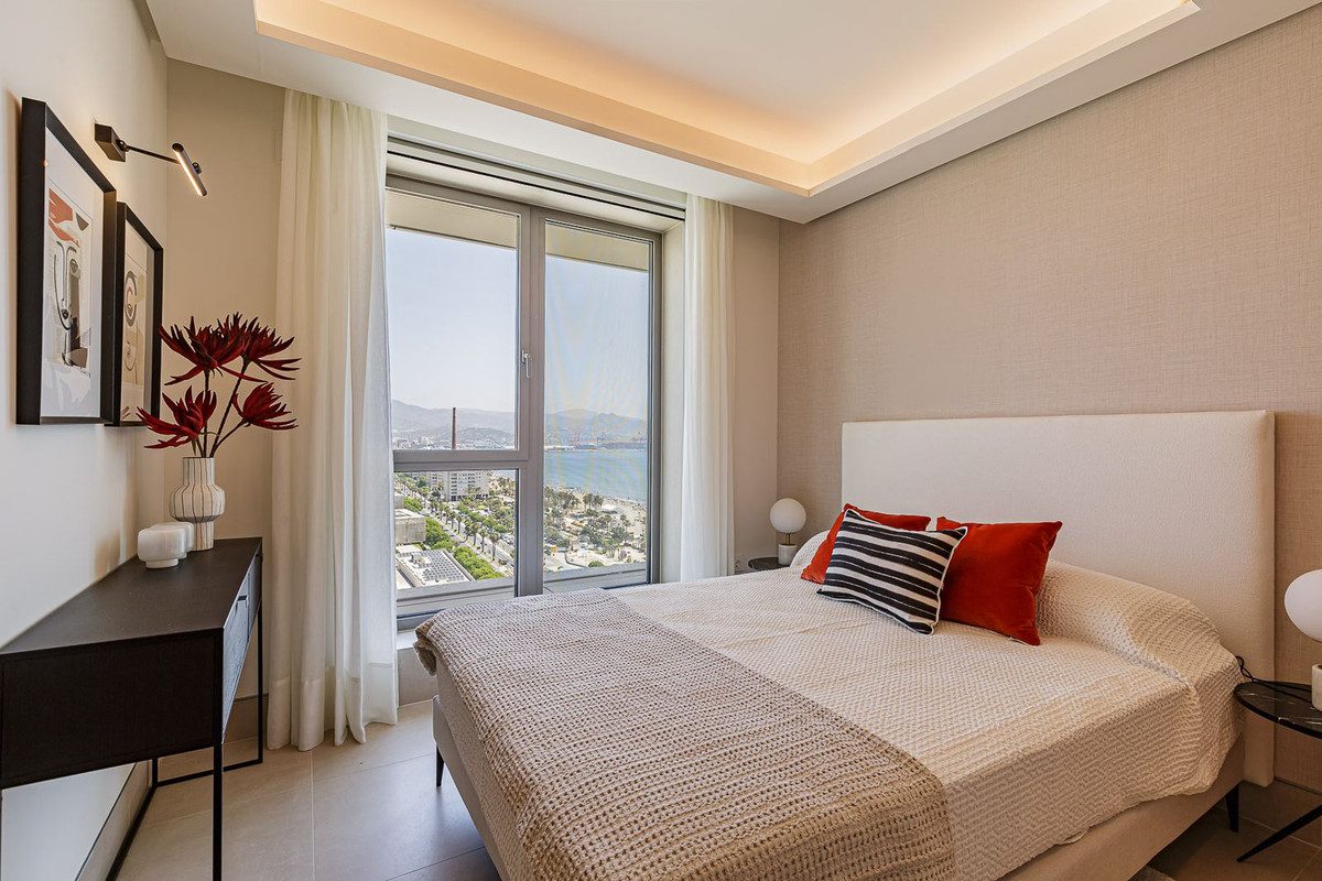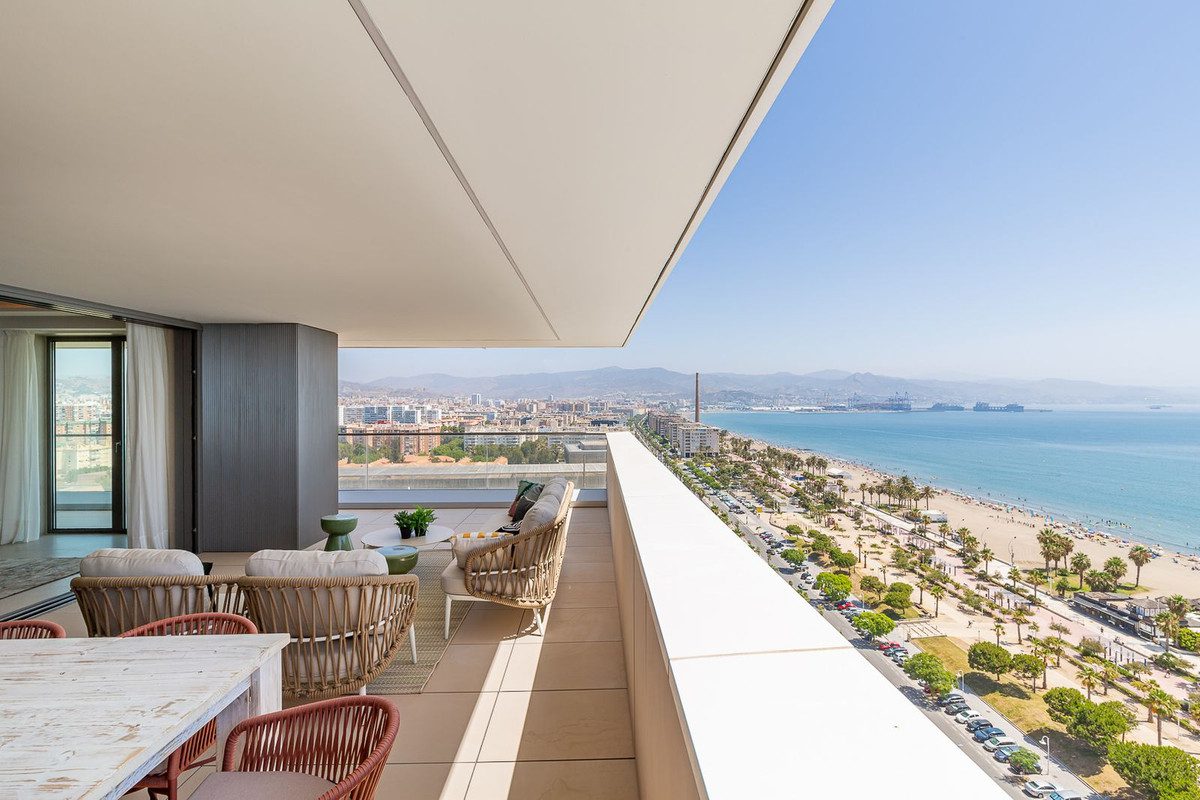 Este apartamento a estrenar está situado en la planta 15 de las emblemáticas Málaga Towers, recientemente terminadas.Situado en primera línea de playa y con impresionantes vistas panorámicas, este omplejo establece un nuevo estándar en la vida de lujo en Málaga.El edificio, terminado en 2024, cuenta con recepción/conserjería 24 horas, una impresionante piscina en la azotea en la planta 21 con bar para uso de los residentes, piscina cubierta climatizada con solárium, piscina exterior de forma libre con solárium independiente y camas balinesas, zona de spa que incorpora otra piscina cubiertaclimatizada, sauna, baño turco, ducha de agua fría, lluvia tropical y fuente de hielo. Otras ventajas incluyen un gimnasio totalmente equipado con zona de pilates al aire libre, sala de juegos para niños y zona de entretenimiento,y una sala de reuniones de coworking totalmente equipada con terrazas independientes.La propiedad se encuentra en la planta 15 y ofrece unas increíbles vistas panorámicas. El apartamento se vende totalmente amueblado, consta de un amplio vestíbulo de entrada, con baño de invitados, salón diáfano, cocina totalmente equipada de Gunni amp; Trentino con electrodomésticos Miele, enorme terraza cubierta de 44 metros orientada al sur con vistas al Mediterráneo yal puerto de Málaga. El alojamiento incluye una suite principal con vistas al mar, un segundo dormitorio con vistas al mar y baño en suite, y los dormitorios tres y cuatro con baño familiar compartido. Algunas de las características más importantes de la propiedad son el sistema de domótica ABB freehome, el sistema aerotérmico Daikin para el aire acondicionado, así como calefacción por suelo radiante y persianas Bandaluxcon integración Somfy. Incluye 2 plazas de garaje y trastero.~