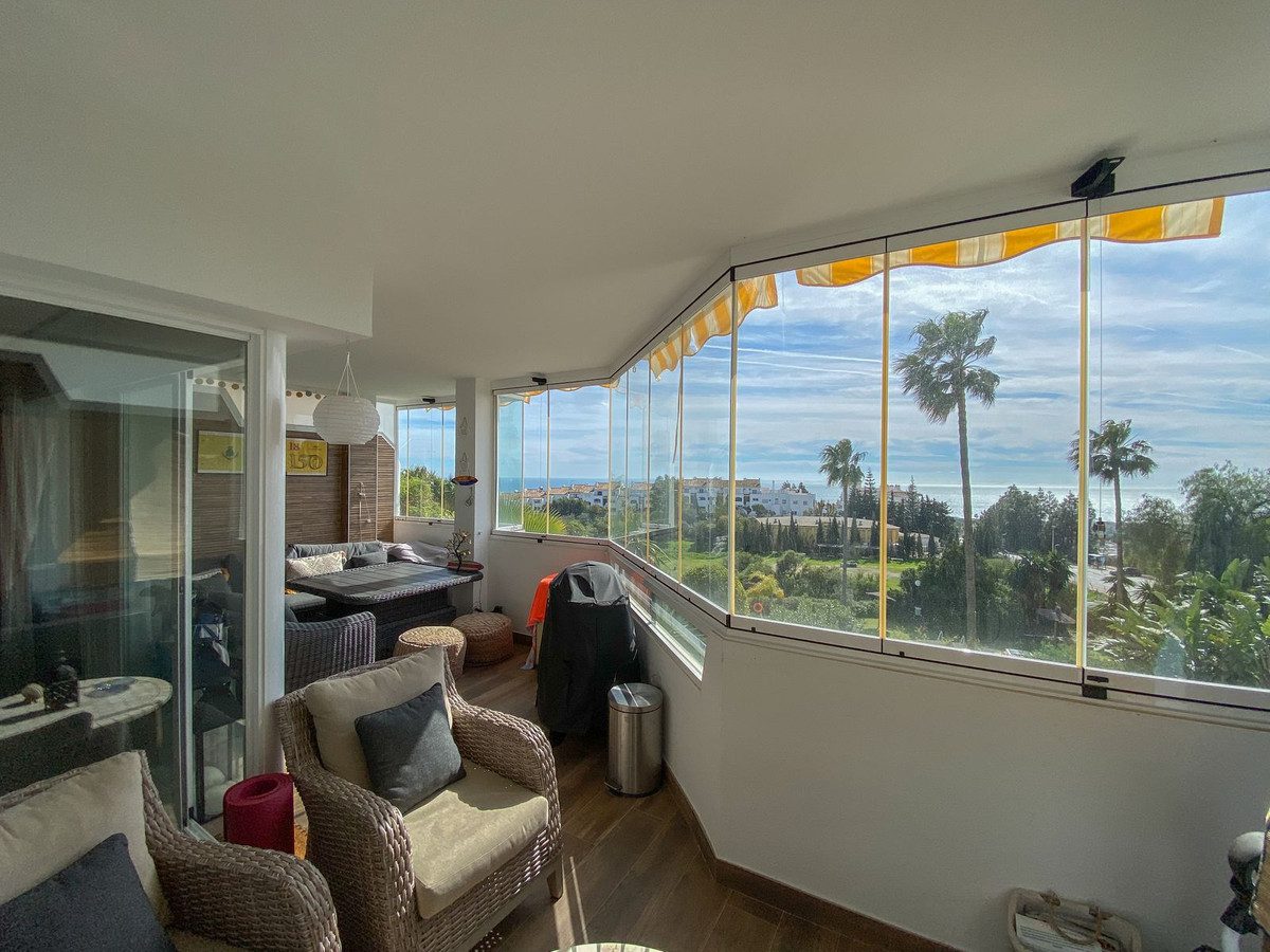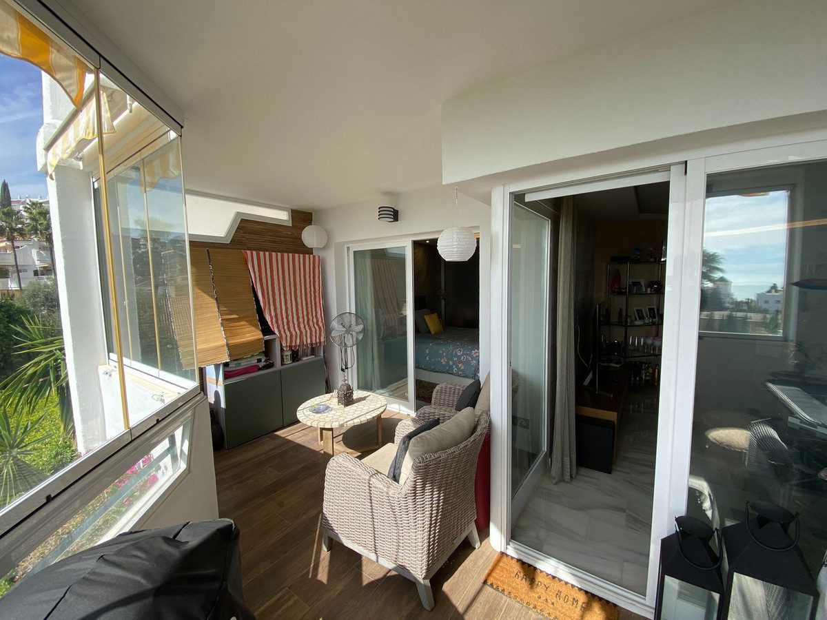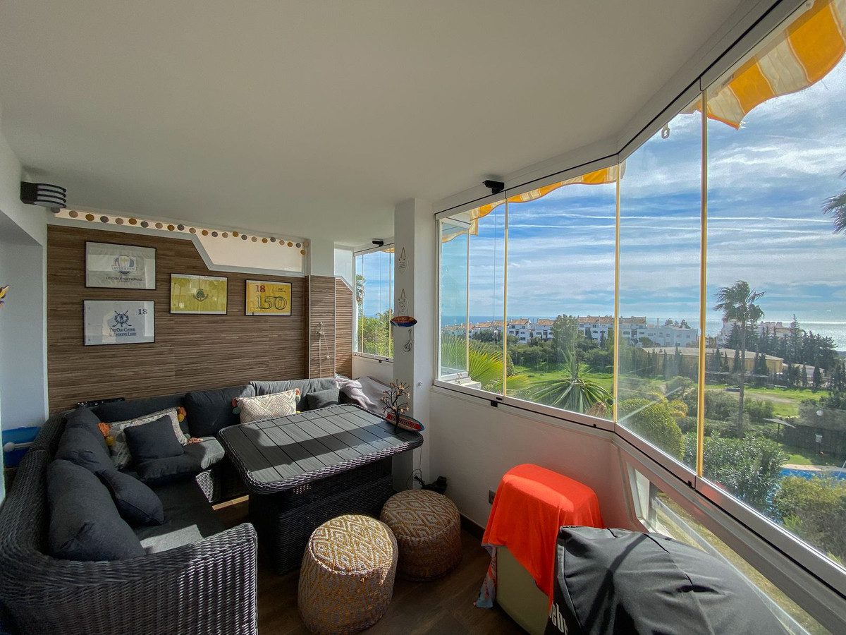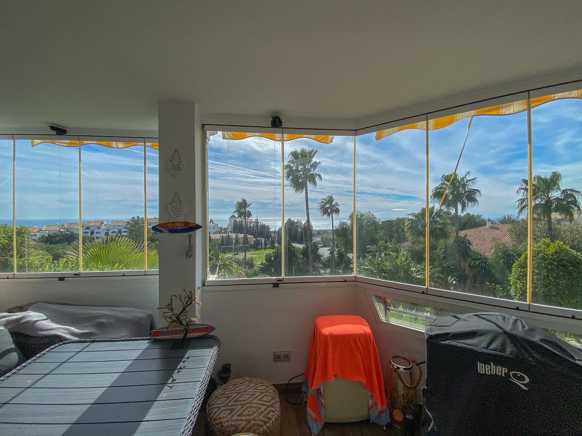 Apartamento moderno con vistas panorámicas al mar en CalahondaPresentamos una vivienda en planta baja elevada (se siente como 1era planta) renovada con gusto, situada en una de las comunidades más atractivas y mejor mantenidas de Calahonda. Un lugar ideal para quienes buscan paz, comodidad y una conexión directa con el entorno mediterráneo.El apartamento ofrece dos dormitorios espaciosos y dos baños, uno de ellos en suite dentro del dormitorio principal, donde un elegante cerramiento de cristal aporta amplitud y luminosidad. El salón, de ambiente cálido y relajado, se extiende hacia una amplia terraza desde la que se disfrutan unas vistas espectaculares al mar y a la zona de piscina.La terraza ha sido acondicionada con sistema Lumon y toldos, lo que permite aprovecharla tanto en verano como en invierno. Desde el salón y el dormitorio principal se accede directamente a este espacio exterior, perfecto para disfrutar de una comida al aire libre o simplemente contemplar el horizonte.El complejo residencial destaca por sus jardines cuidados, dos grandes piscinas y un entorno tranquilo, con zonas comunes impecables y aparcamiento para residentes.Un valor añadido es que el terreno frente al edificio no es edificable, por lo que las vistas abiertas al mar estarán siempre protegidas.En definitiva, un hogar moderno, luminoso y con una ubicación excepcional, pensado para disfrutar plenamente del estilo de vida costero.~