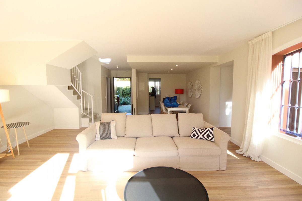 Adosada en esquina lista para entrar a vivir; Desde el jardín delantero y través de unas escaleras se accede a la entrada de la vivienda, abre a un gran salón con chimenea con mucha luz durante todo el día ya que es orientación sur; en esta planta hay además una cocina independiente, con pequeño comedor, un aseo de invitados y una pequeña habitación extra perfecta para despacho, o para cuarto de jugar, desde la que se pasa al garaje de la vivienda; esta planta abre al gran jardín privado delantero en dos alturas y desde el que se accede a su vez al precioso jardín de la comunidad; La vivienda esta el Lomas de Monte Biarritz una de las urbanizaciones mas bonitas y mejor cuidadas de la zona;En planta primera dispone de 3 dormitorios, el principal con baño en suite, zona de armarios y acceso a dos terrazas una de ellas enorme tipo solárium; , las otras dos habitaciones tienen también armarios empotrados y comparten otro baño; la casa tiene una planta mas de ático donde se ubica una pequeña habitación abuhardillada con una gran terraza que disfruta de amplias vistas.La vivienda ha sido reformada recientemente en su totalidad por arquitectos; así que esta lista para entrar a vivir ; La comunidad esta muy bien cuidada y gestionada. Cuenta con amplios y bellísimos jardines y 2 piscinas, una de adultos y otra de niños;Es una casa perfecta para familias con niños, ya que hay mucho ambiente; y también estupenda para vivir todo al año; ya que esta al lado de todos los servicios: El Centro Comercial Guadalmina y también varios colegios están al lado; quieres verla ? Llámanos y te la enseñamos!!~