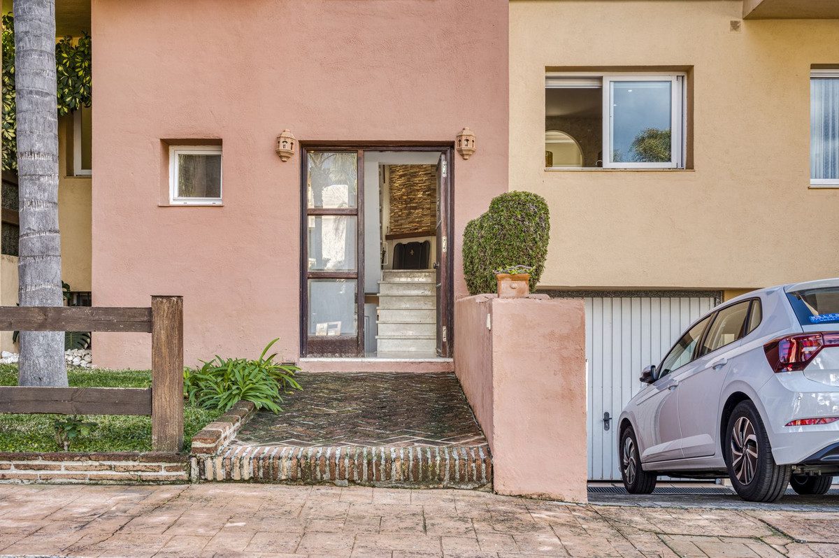 Descubre este precioso adosado situado en una tranquila y cuidada urbanización cerrada en Marbella, ideal para quienes buscan comodidad, privacidad y una excelente ubicación, a pocos minutos de los principales puntos de interés de la Costa del Sol.La vivienda se distribuye en tres plantas y cuenta con 217 m² construidos sobre una parcela de 371 m², ofreciendo amplios espacios tanto interiores como exteriores. Dispone actualmente de tres dormitorios, con la interesante posibilidad de habilitar un cuarto dormitorio en la planta sótano, lo que aporta una gran versatilidad para adaptarse a distintas necesidades familiares o de uso.En la planta principal encontramos un luminoso salón con chimenea, un espacio acogedor y confortable con salida directa a una preciosa terraza, perfecta para disfrutar del clima mediterráneo y de las agradables vistas al mar y a la montaña. La vivienda cuenta además con una cocina independiente, dos baños completos y un aseo de cortesía.En el exterior, la propiedad ofrece un jardín privado que invita al descanso y al disfrute al aire libre durante todo el año. El adosado forma parte de una comunidad privada y cerrada que dispone de piscina comunitaria, ubicada en una zona especialmente tranquila y cuidada.La propiedad incluye aparcamiento subterráneo privado y se encuentra a tan solo cinco minutos de Puerto Banús y del centro de Marbella, con fácil acceso a playas, comercios y restaurantes. El aeropuerto de Málaga se sitúa a aproximadamente 45 minutos, lo que convierte esta vivienda en una excelente opción tanto como residencia habitual como segunda vivienda o inversión.~